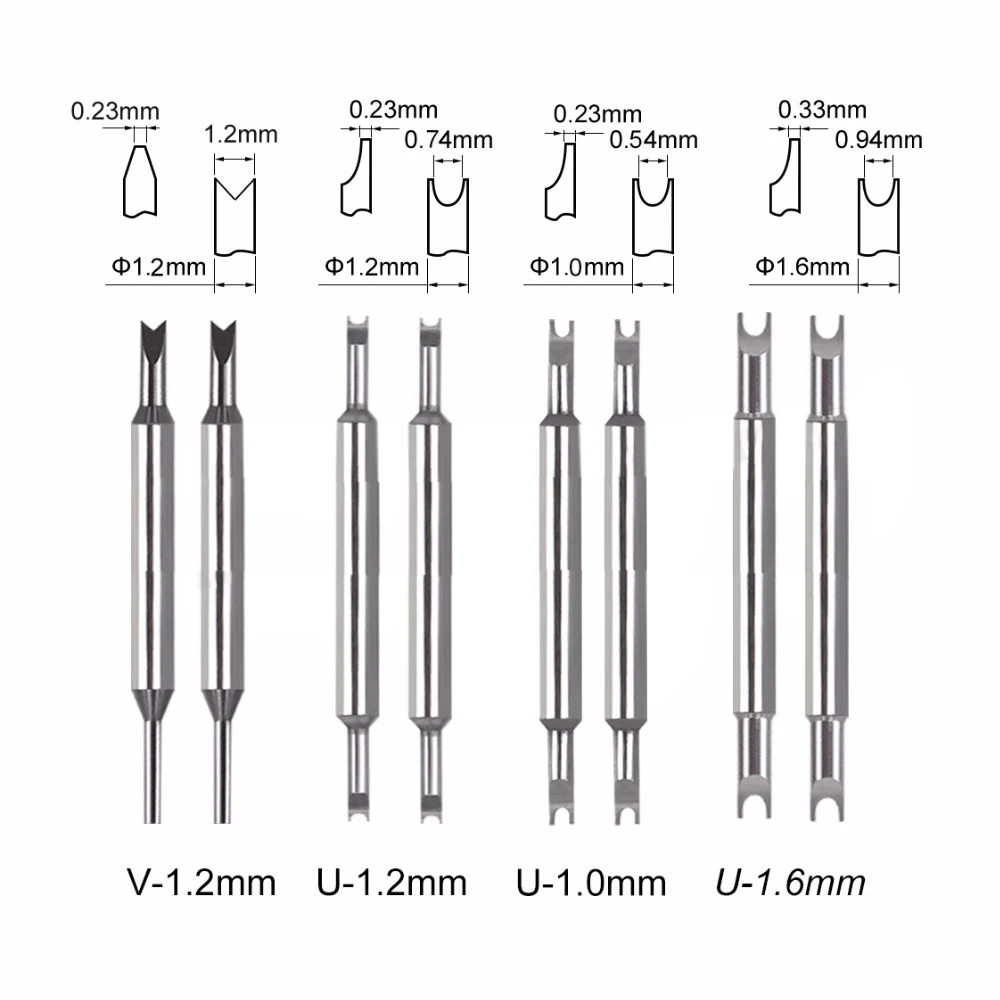 Компактный размер-длина всего 4 дюйма и инструмент включает в себя 4 набора универсальных взаимозаменяемых вилок из нержавеющей стали с вариантами 4 различных реверсивных концевых вилок размера s (тип наконечника и Размер s:U-1.6mm, u-1.2mm, U-1.0mm, V-1.2mm/Pin)