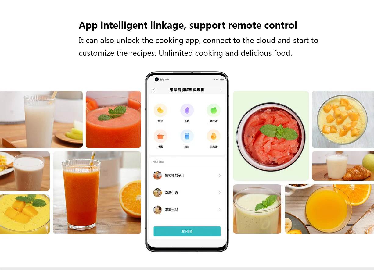 Название продукта: интеллектуальное разрушение стены приготовления пищи Номинальное напряжение: 220 В мощность смешивания: 1000 Вт Максимальная емкость горячего напитка: 1200 мл Размер продукта: 188 × 222 × 436 мм Модель продукта: номинальная частота MPBJO01ACM: 50 Гц Мощность нагрева: 800 Вт Максимальная емкость холодного напитка: 1600 мл