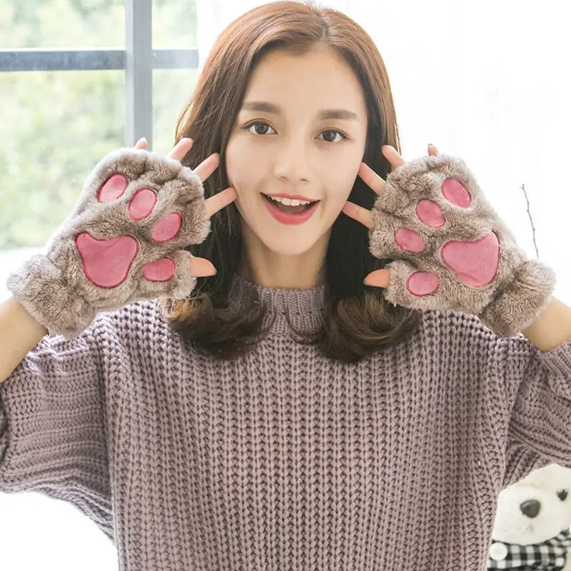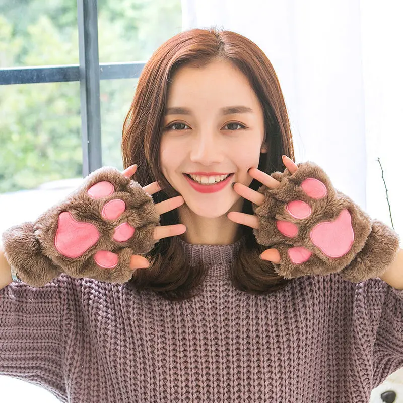 перчатки без пальцев Новые варежки с кошачьим когтем, зимние плюшевые перчатки с медвежьей лапой, зимние плюшевые перчатки без пальцев, зимние вязаные перчатки для набора текста для девочки, подарок,варежки