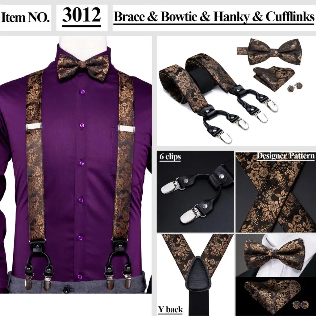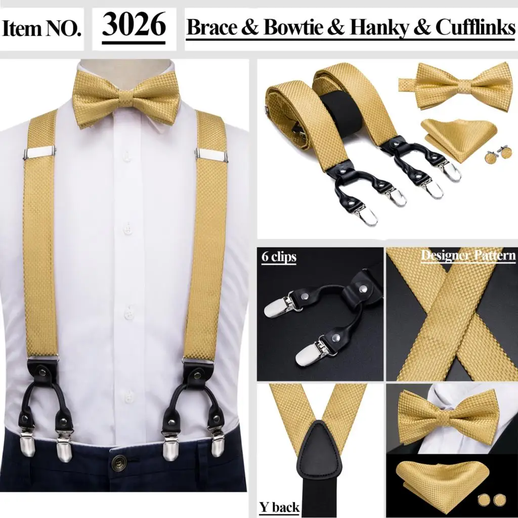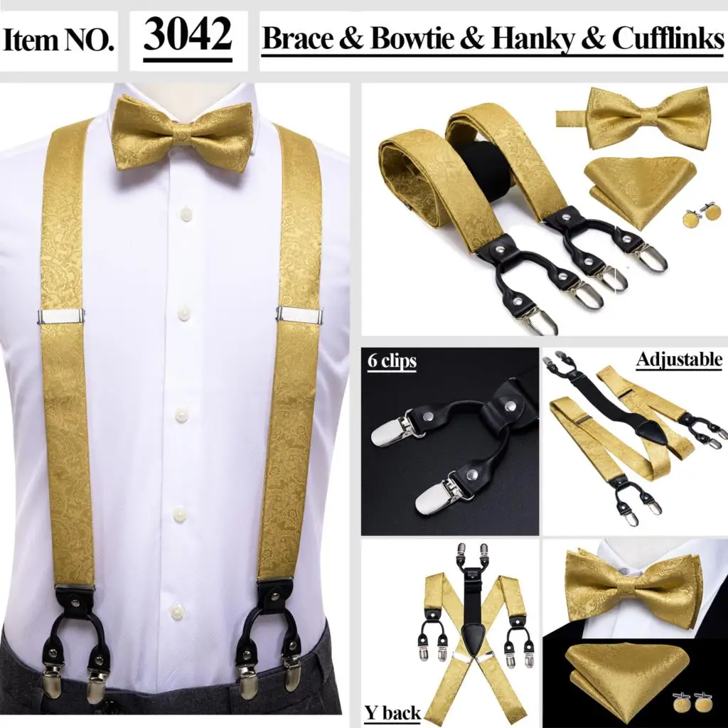Привет-галстук Шелковый мужской подтяжки набор золотой простой жаккард 6 зажимов мужской подтяжки галстук-бабочка платок запонки черный кожаный Y задние ремни подарок