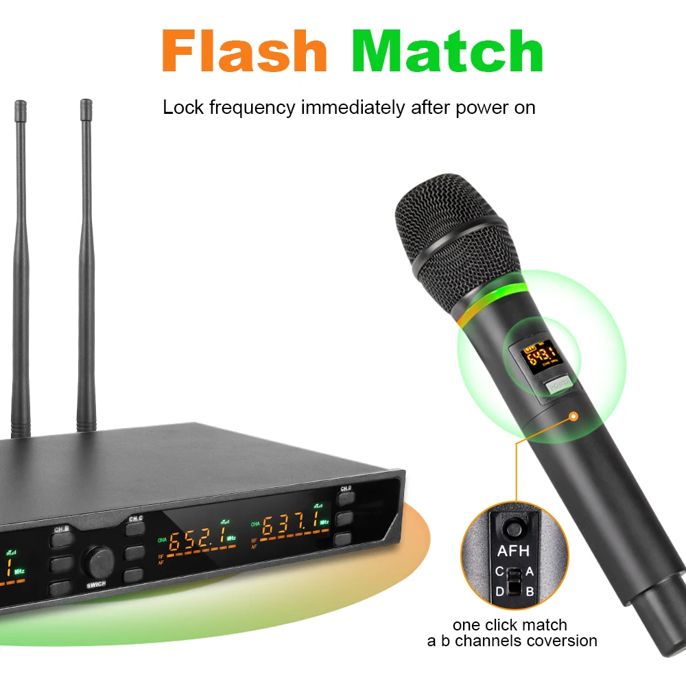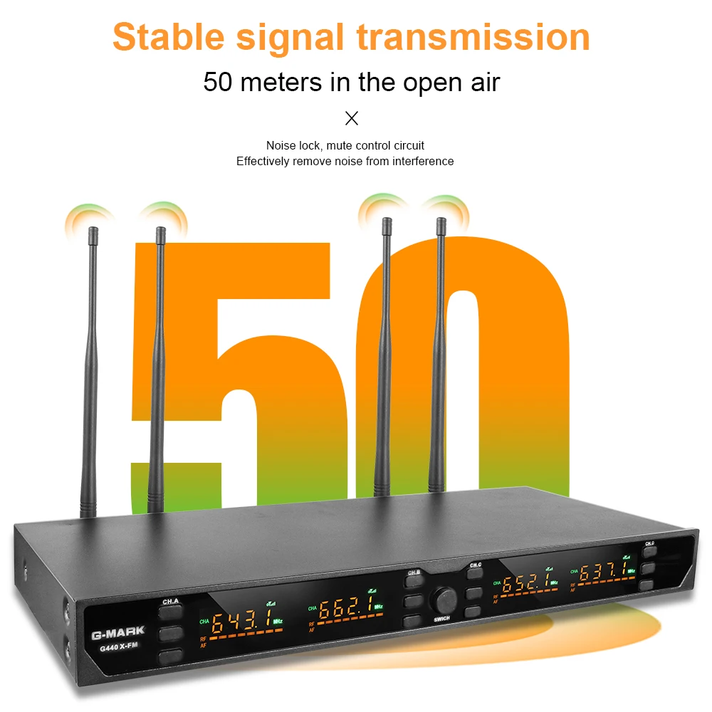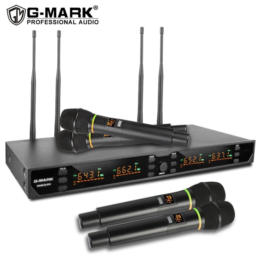 Беспроводной микрофон G-MARK G440XFM, 4 канала, Портативный динамический микрофон для караоке, с УВЧ диапазоном, металлический корпус для диджея, вечеринки, сцены, церкви, шоу
