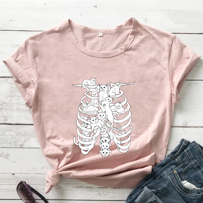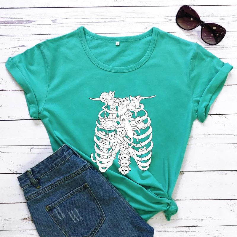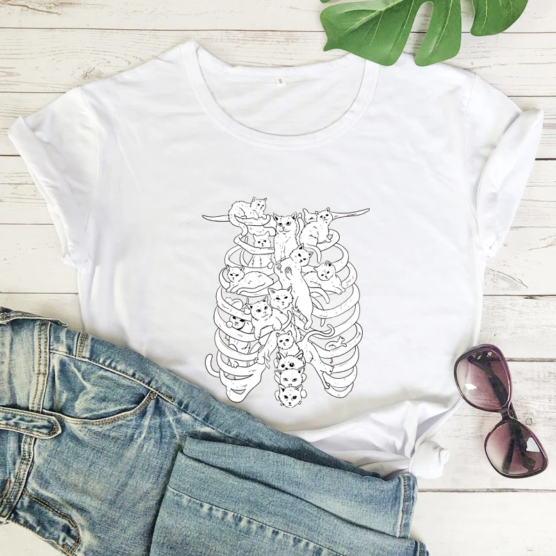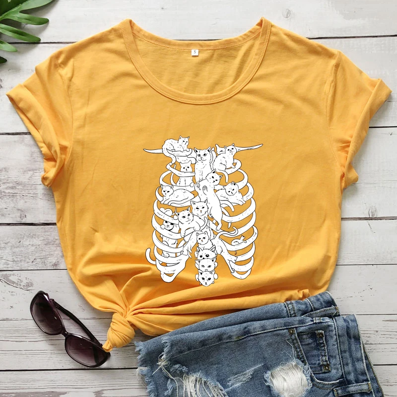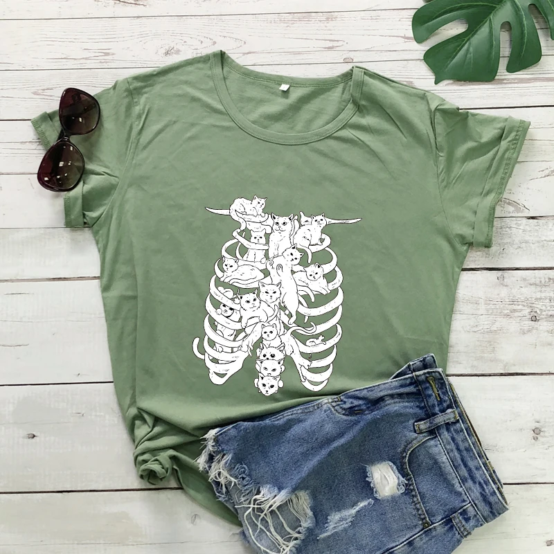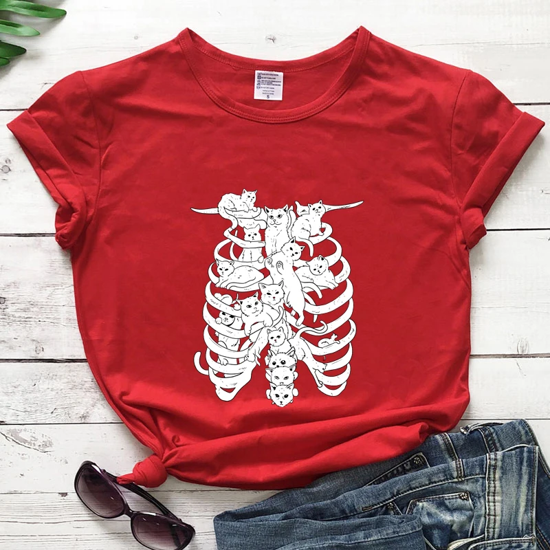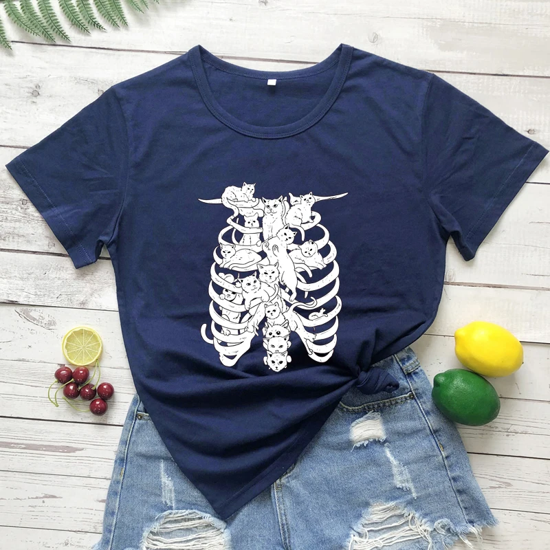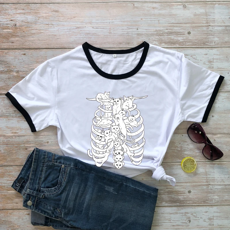 Футболка в рубчик с кошками, жуткий череп, графическая футболка на Хэллоуин, забавная кошка, мамина, Готическая художественная футболка, топ