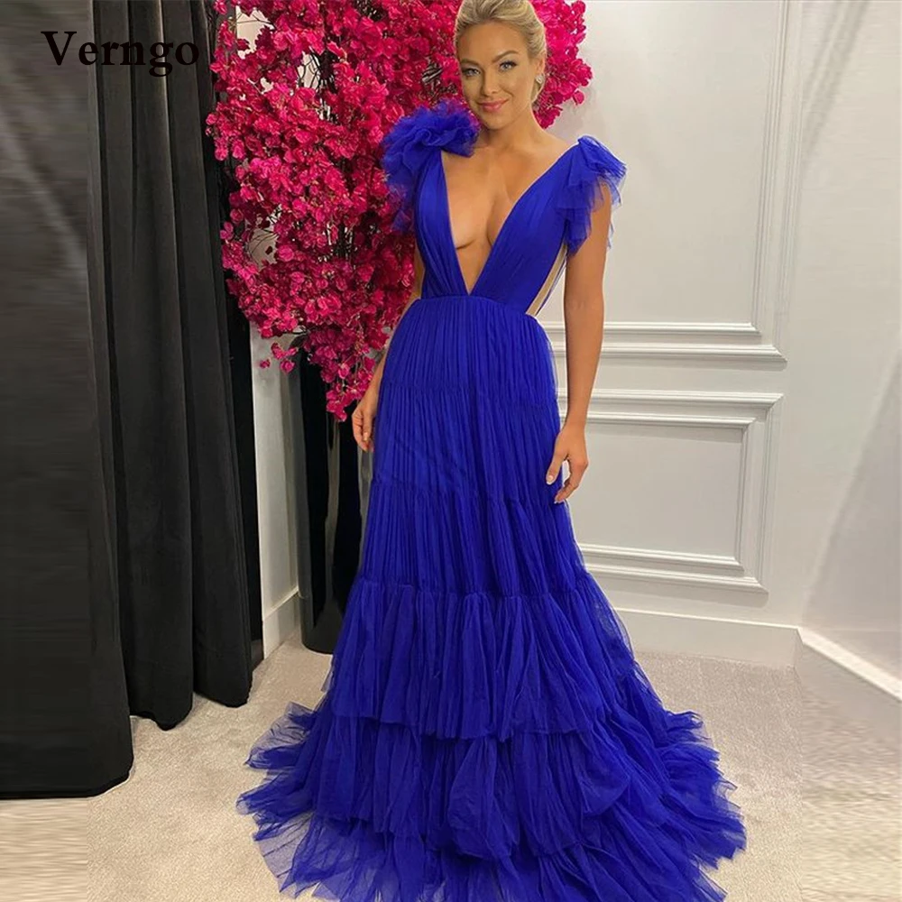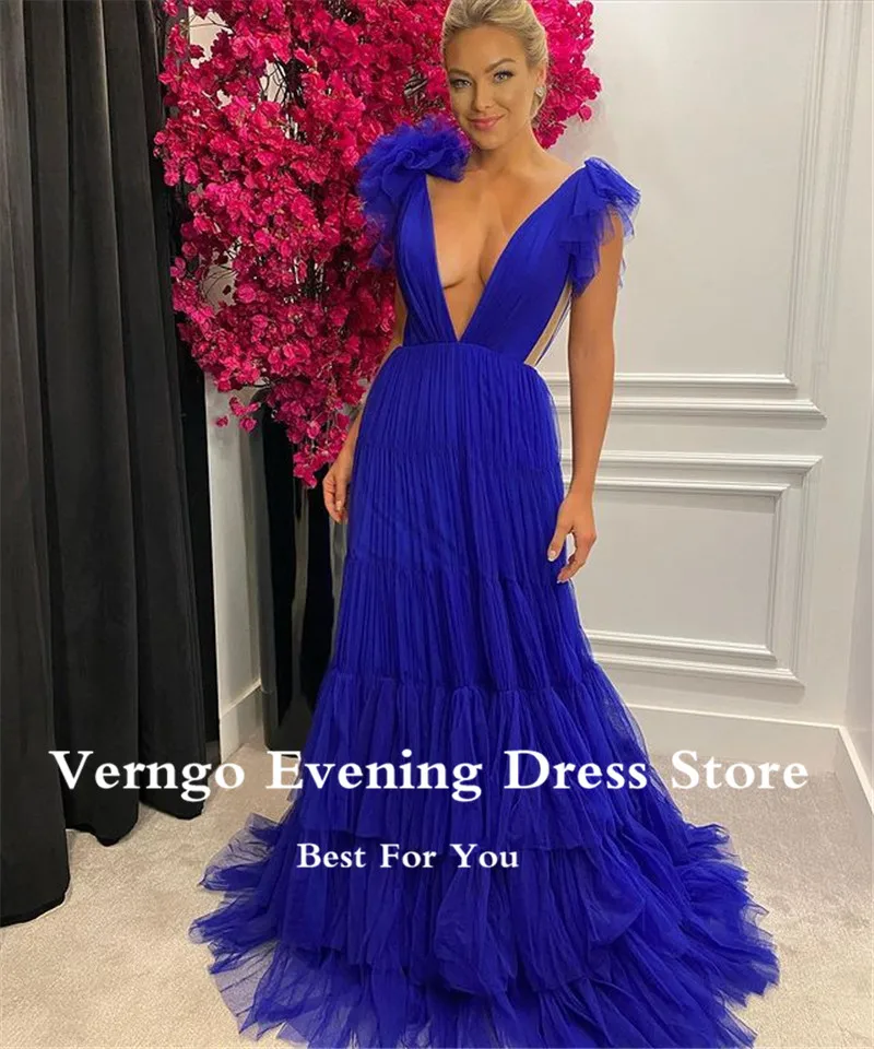 Пикантное платье для выпускного Verngo с глубоким V-образным вырезом и открытой спиной, длинное Королевское синее Многоярусное платье, вечерние платья из тюля, платье для особых случаев