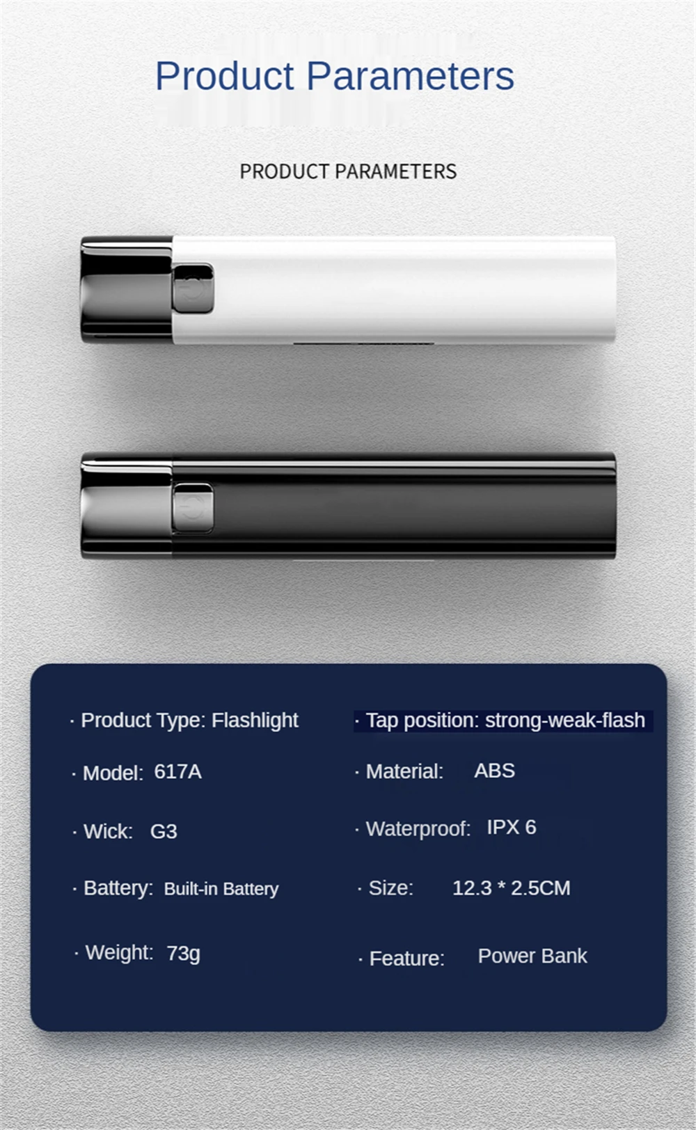 Упаковочные коробкиСпособ зарядки: зарядка через USBМатериал: АБС-пластикБатарея: встроенная батареяВес: 73 гРазмер: 12,3*2,5 см3 передачи: сильный-слабый-импульсныйЛампы: P900Водонепроницаемость: IP65Особенности: портативный мини-аккумулятор, водонепроницаемый