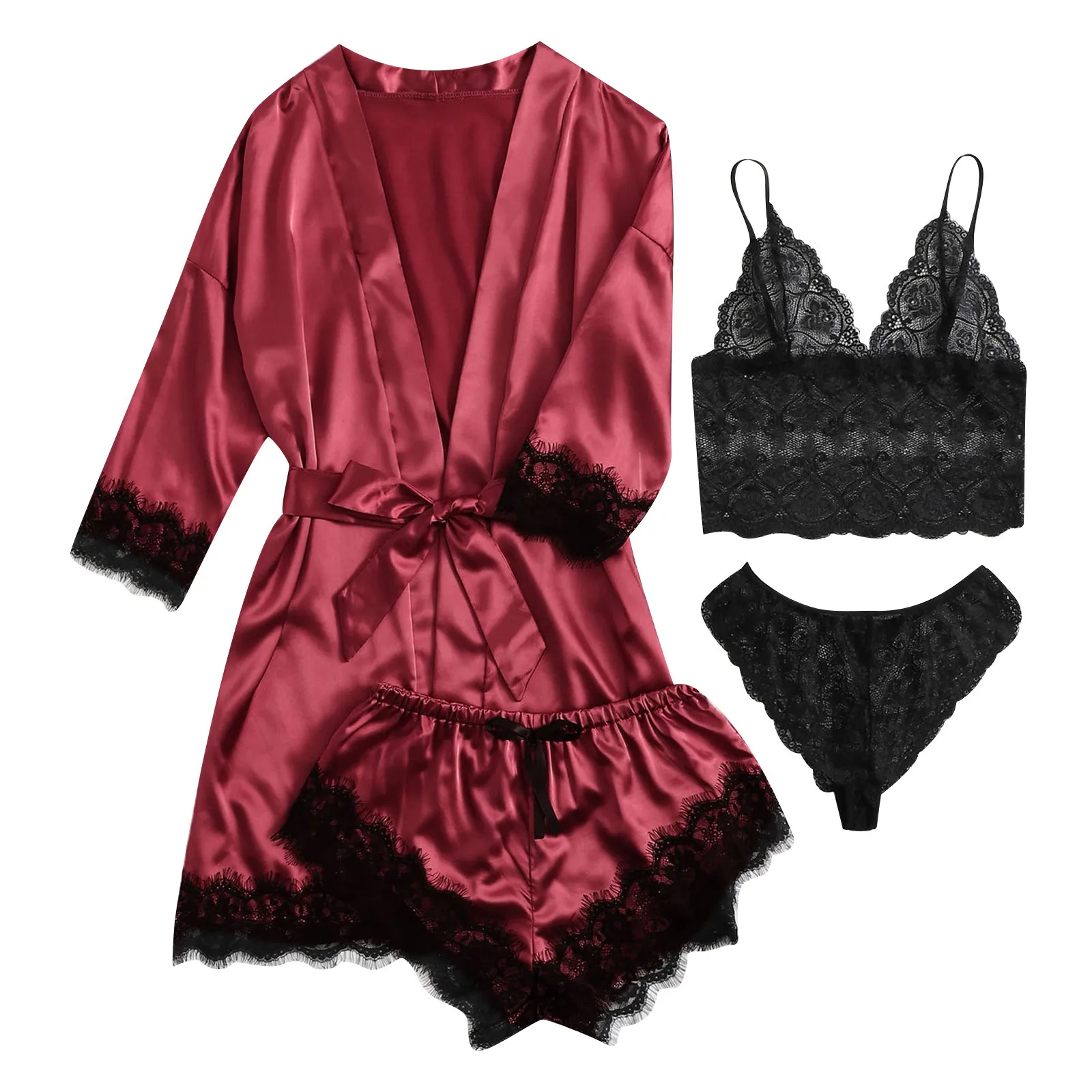 Пижама женская атласная с цветочной кружевной отделкой, 4 шт.
