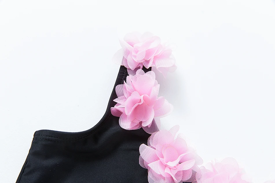 Детский раздельный купальник для девочек, черный купальник с косыми плечами и розовыми цветами, комплект бикини, 2021