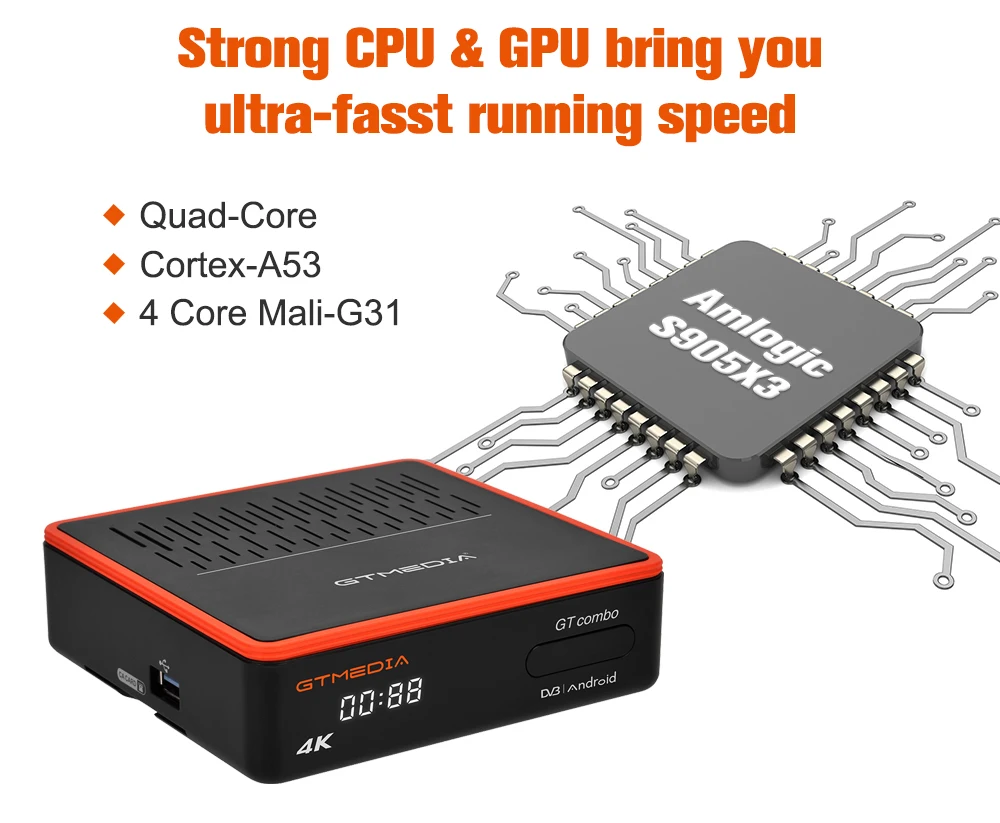 1. Android 9.0 TV BOX + DVB-S/S2/S2X,DVB + T/T2/Cable/ATSC-C(J.83B)/ISDBT, AVS +HEVC main 10 profile(10 бит),AUTO BISS,T2MI,GTFeeds,YUV422,Gtshare2.Amlogic S905X3 2GBRAM + 16GBROM3. Поддержка 4K ультра-высокой четкости дисплея и декодера, двухъядерный процессор MIPS75Kf;4. Поддержка Unicable, DiSEqC1.0/1,1/1,2/USALS мотор полностью поддерживает;5. Поддержка полного ключа PowerVu, DRE & Biss; AUTO BISS6. Встроенный Wifi 2,4G/5G + BT4.1, 802.1.1b/g/n/ac7. Система является GT UI, GTStore Addons предустановленной.8. Поддержка IPTV на GTPlayer,9. Поддержка CCCAM, NEWCAM, MGCAM и CA декодирование карт;