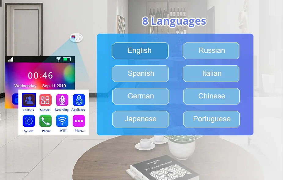 Оснащенная многоязычным меню и голосовыми подсказками, эта панель сигнализации поддерживает переключение на 8 языках: английский, немецкий, итальянский, русский, испанский, французский, китайский и португальский.