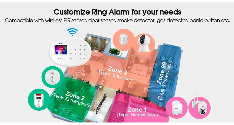 Совместим с беспроводным PIR-датчиком, дверным датчиком, детектором дыма, детектором газа, панической кнопкой и т. д.