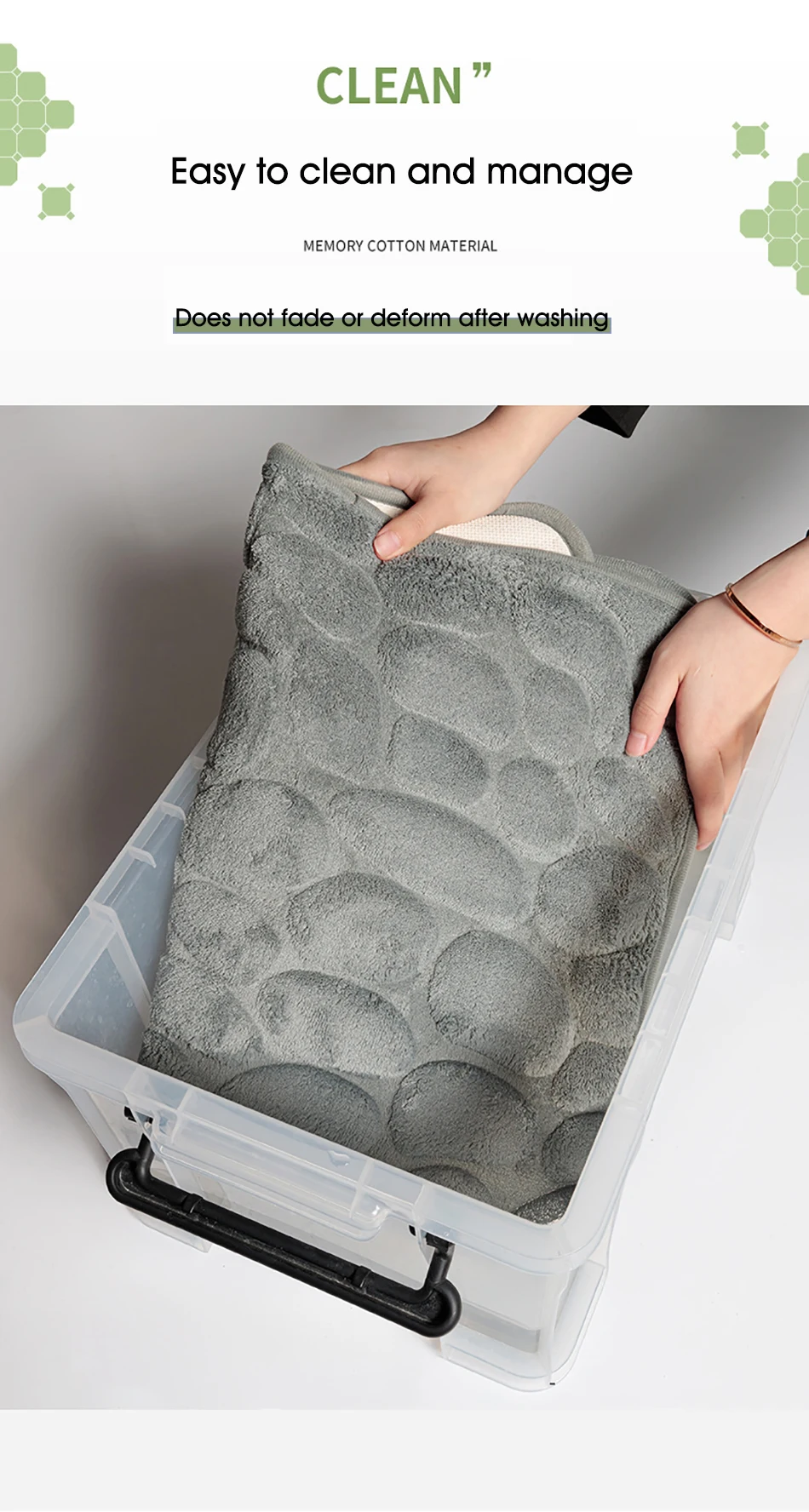 Особенности1. Супер мягкий: коврик для ванной имеет плотную и мягкую пену памяти, которая может обеспечить уникальный комфорт для ваших ног. Ковер разработан специально, чтобы помочь вам устранить давление на ваши ноги и предоставить Вам расширенную поддержку, что другие коврики для ванной не могут обеспечить.2. Супер эффективность поглощения воды: Напольный коврик обладает сильной водопоглощающей способностью. Когда вы наступаете на ноги, вы можете немедленно высушить ноги, защитить ваши ноги от холодной земли и предотвратить промокание пола.3. Противоскользящая Подложка: нижняя часть напольного коврика изготовлена из ПВХ, который может быть прочно закреплен на деревянном полу и плиточном полу, не повреждая пол. После каждого использования убедитесь, что нижняя часть коврика сухая и чистая.4. Рельефный узор из булыжника, 3D эффект.ПараметрыМатериал: поверхность из кораллового флиса + пена с эффектом памятиРазмер: 40*60 см/50*80 смЦвет: белый/черный/серый/хаки