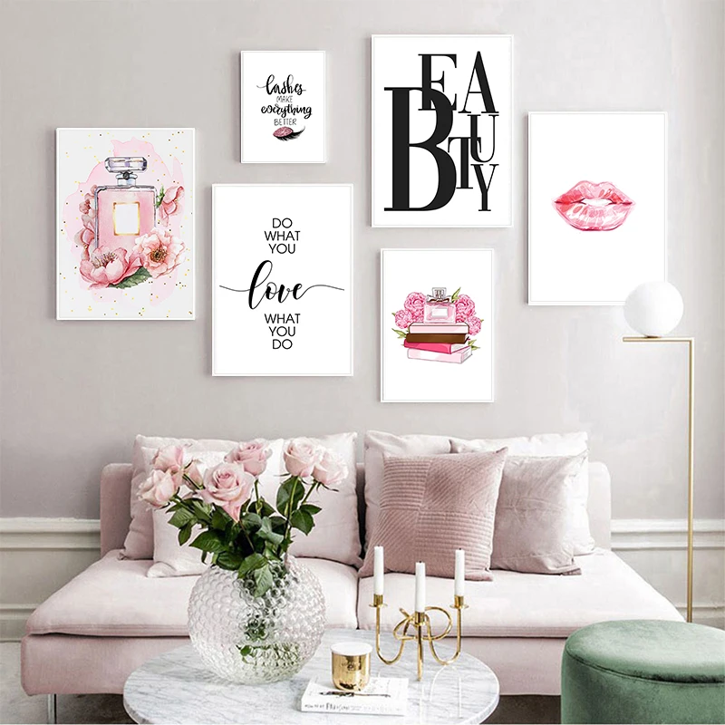 Модный цветочный постер с духами, Модный женский Принт с цитатами красоты, настенное искусство, холст с рисунком губ, книг, современная картина, декор для салона