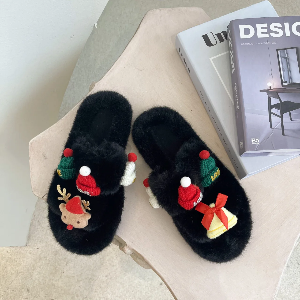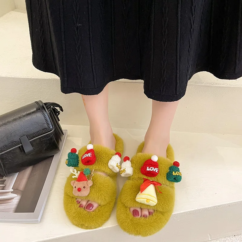 Осенне-зимние 42-дневные рождественские меховые тапочки, женские домашние и уличные теплые однослойные тапочки на плоской подошве для женщин