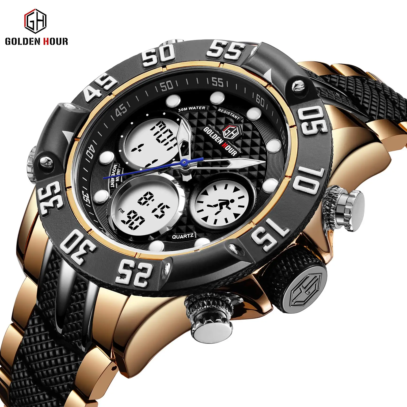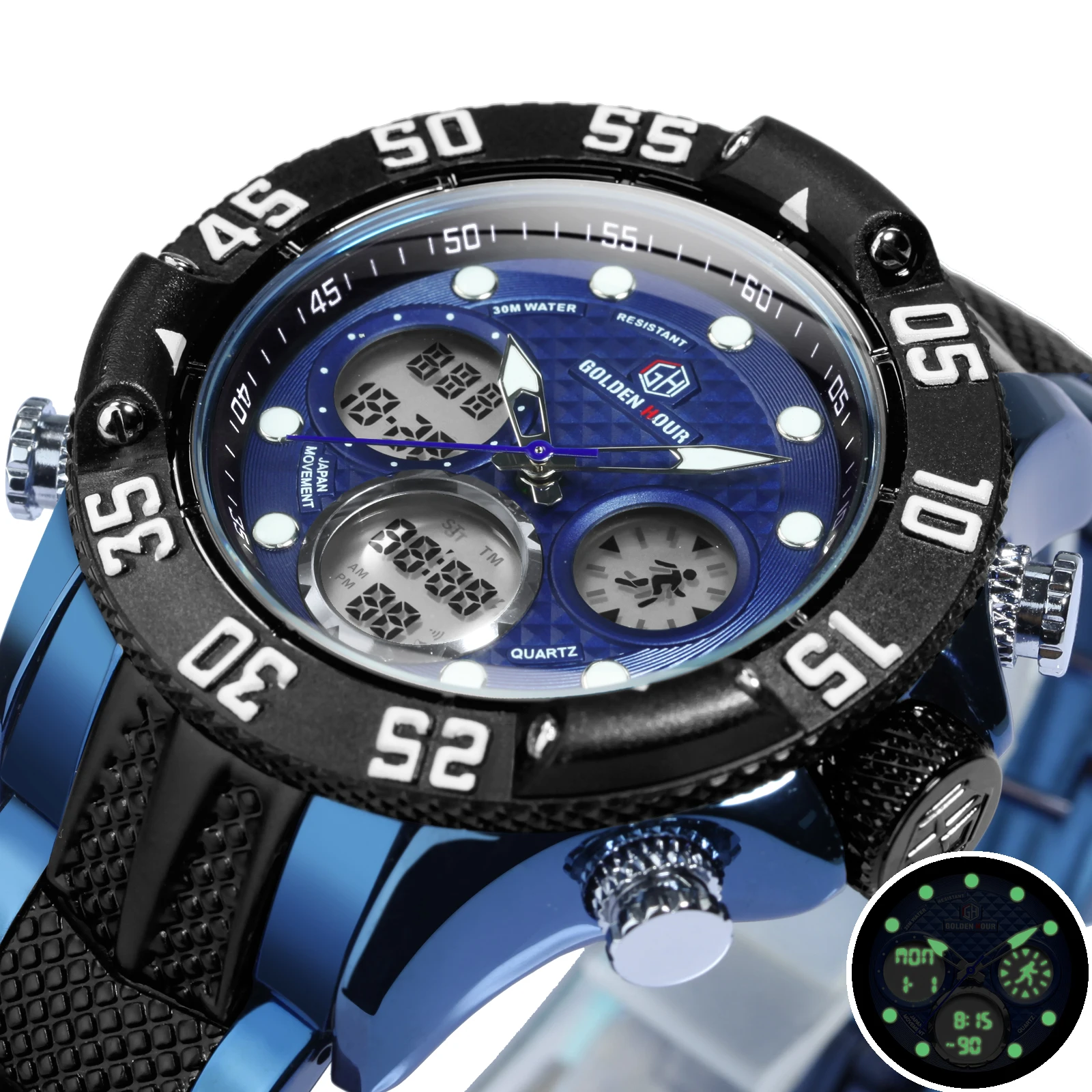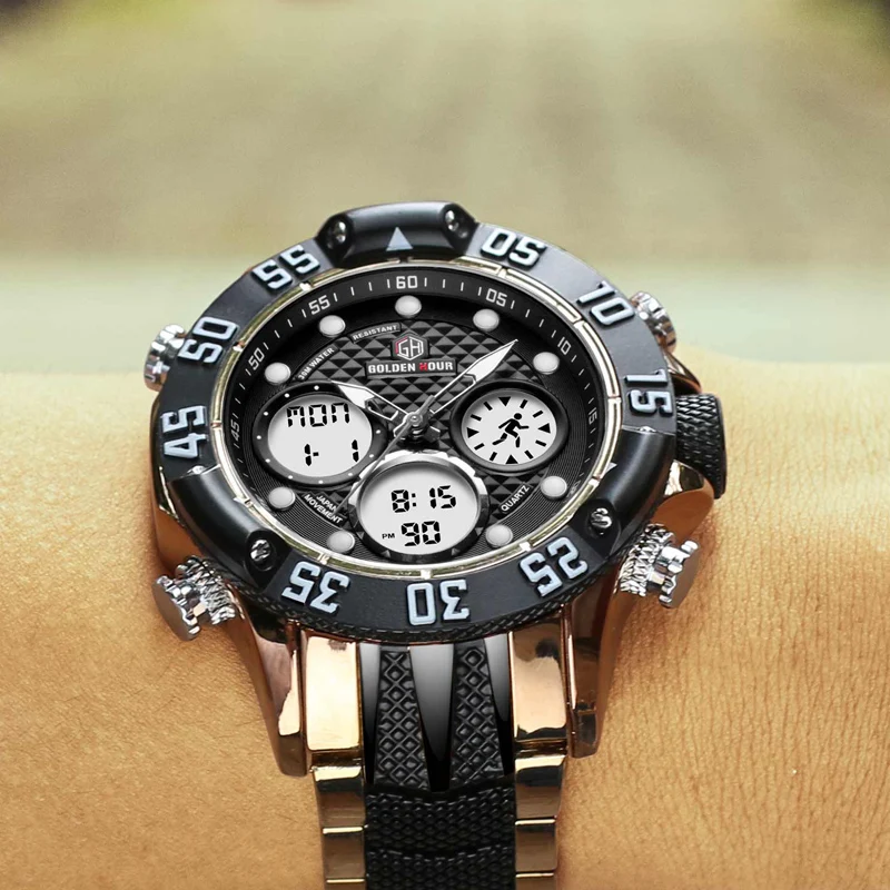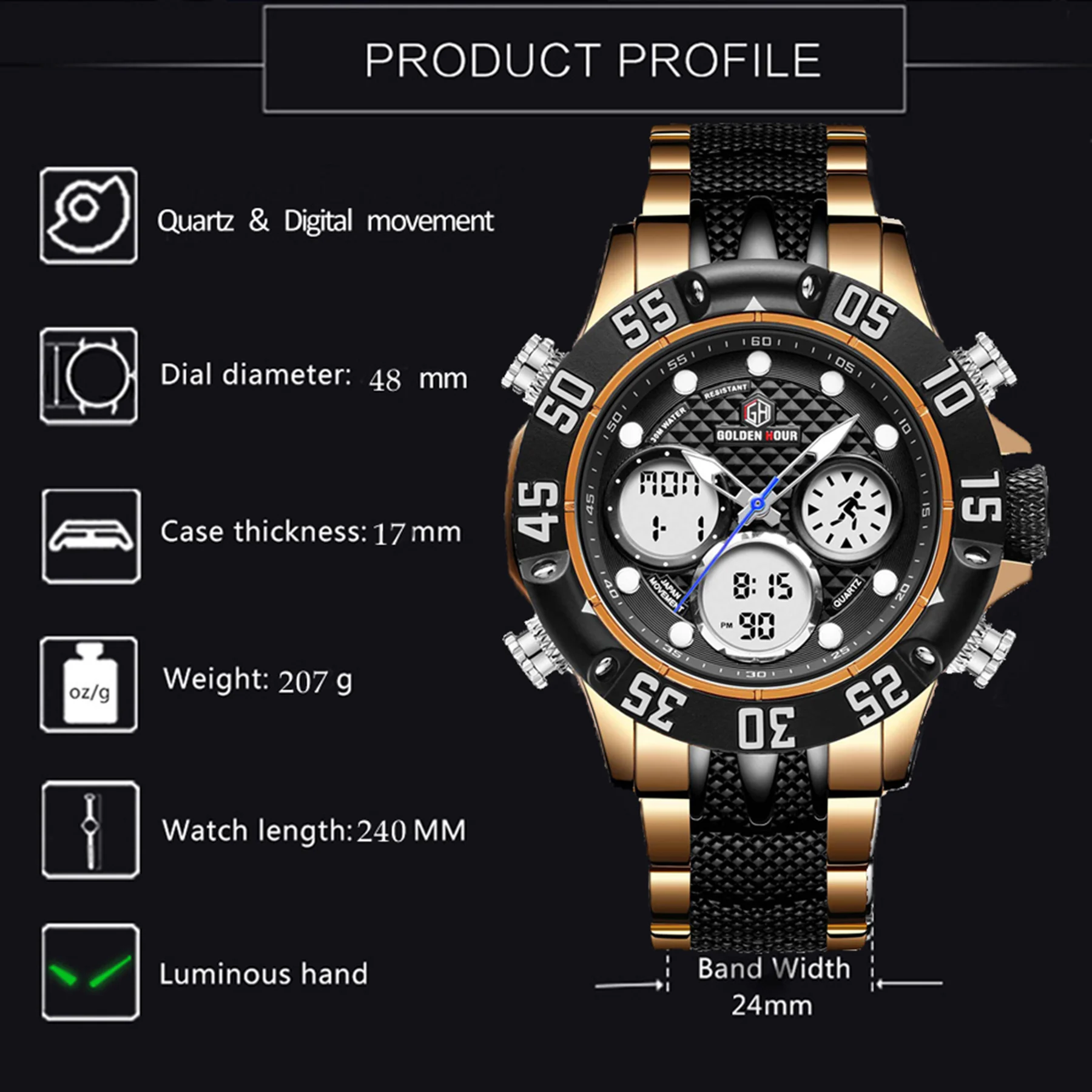 Золотые часы спортивные мужские часыБренд: GOLDEN HOURСтиль: Модный, Повседневный, деловой, роскошный, спортивныйОсновная особенность:1. Часы классического дизайна, модный спортивный стиль2. Наручные часы с кожаным ремешком в духе новых модных тенденций.3. Гарантия на передвижение 12 месяцевХарактеристики:Диаметр циферблата: 48 ммТолщина корпуса: 17 ммДлина Часов: 240 ммШирина ремешка: 24 ммВес часов: 207 гМеханизм: двойной дисплей (требуется батарея)Материал зеркала: HardlexТип застежки: застежка для браслетаВодонепроницаемость: Повседневная Водонепроницаемость (не для плавания или душа)Подходящий повод:Идеально подходит для любых случаев и мероприятий вечерние, годовщины, бизнеса, повседневной носки, занятий спортом на открытом воздухе, занятий в помещении или повседневного использованияПосылка1 х часы (подарочная коробка опционально)