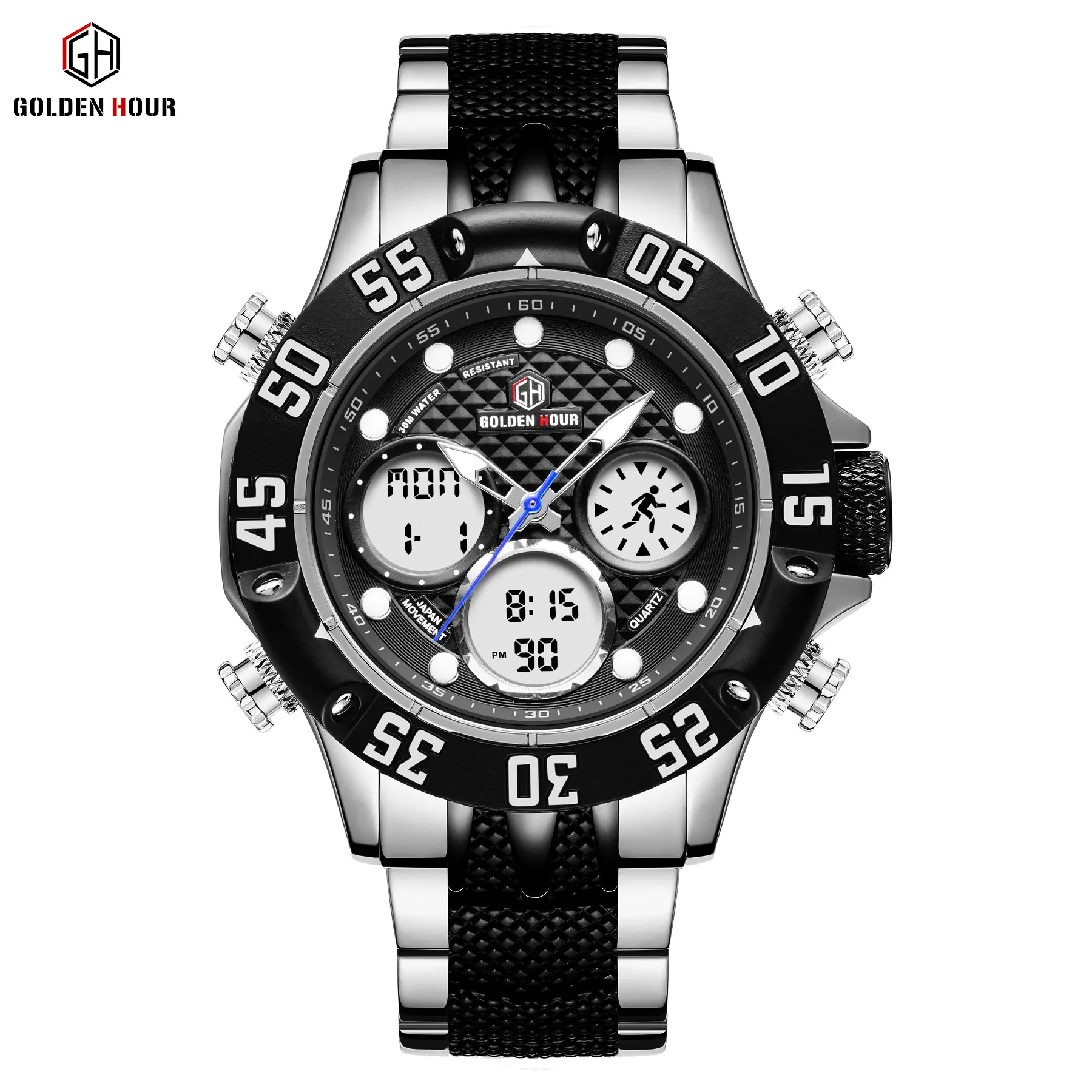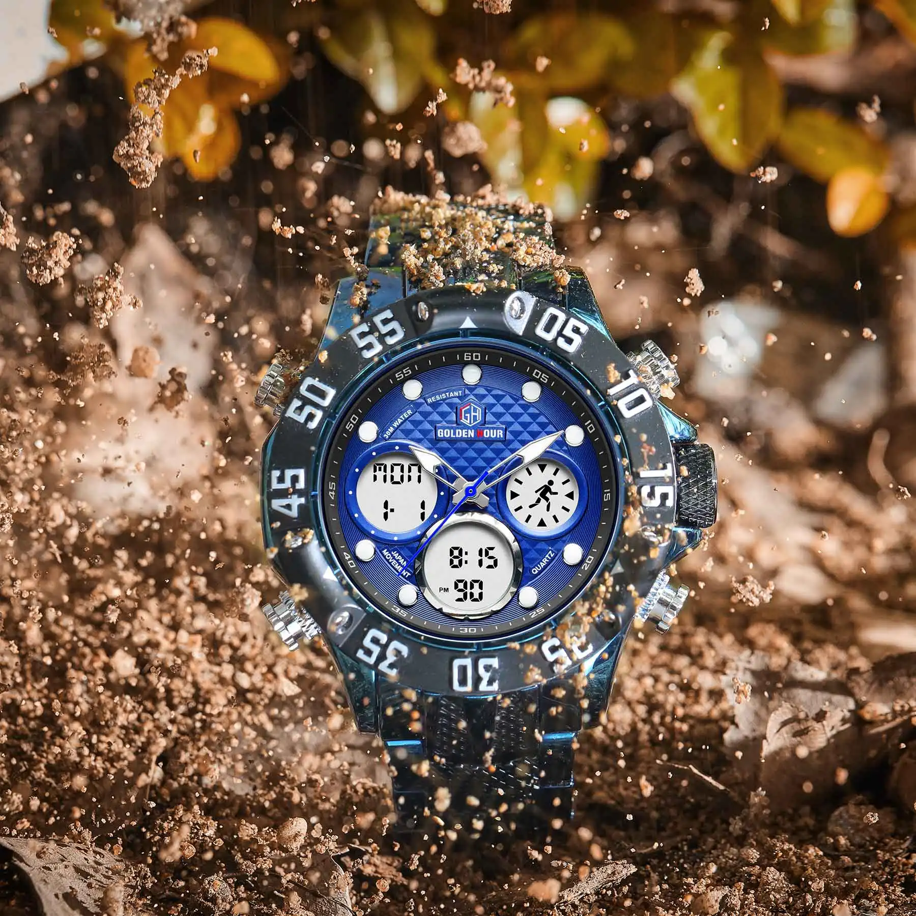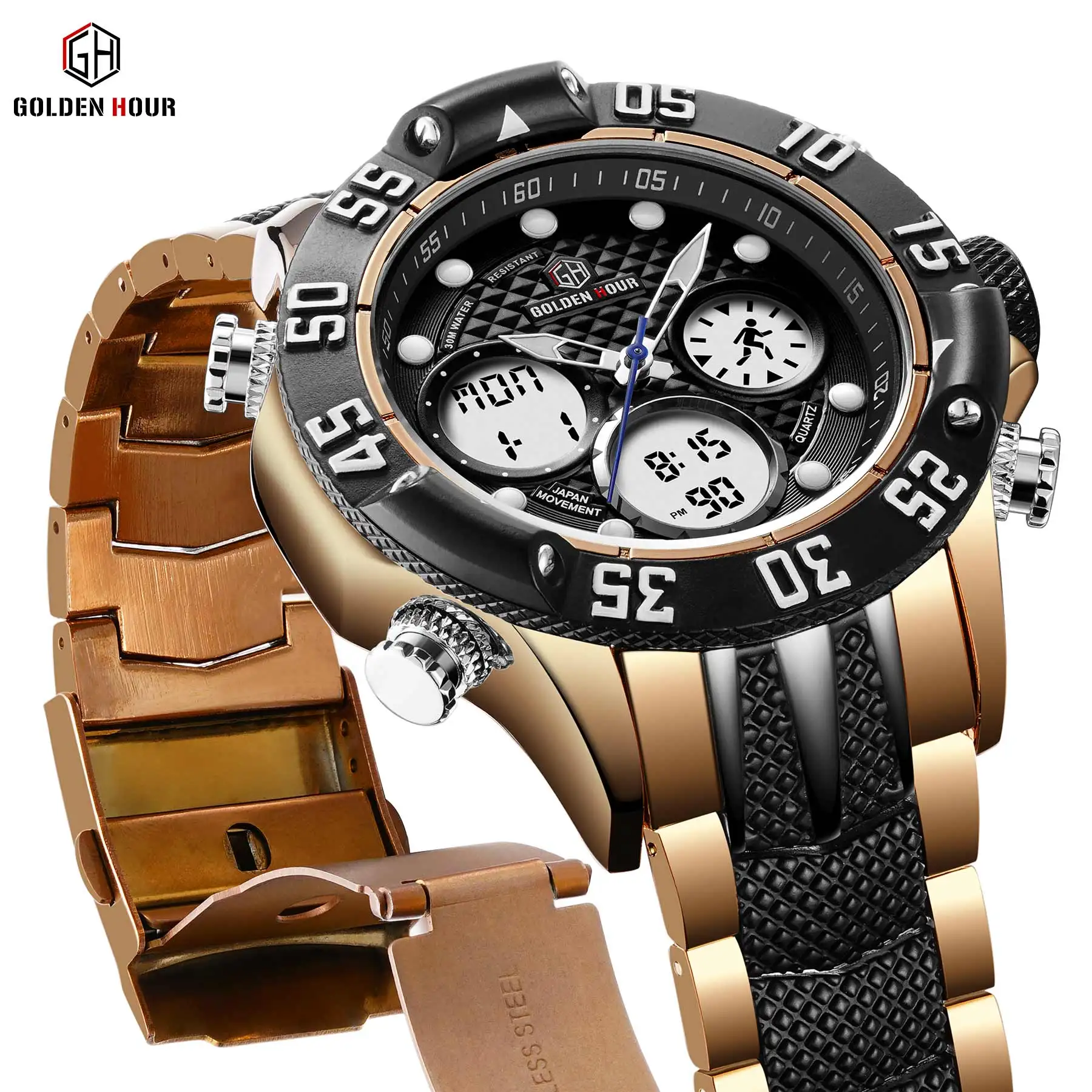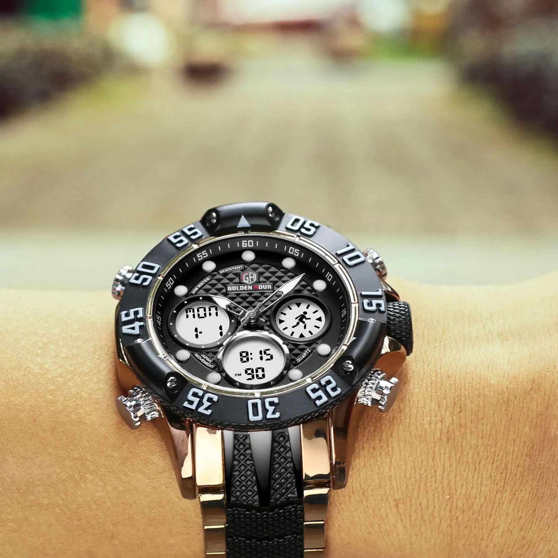 Золотые часы спортивные мужские часыБренд: GOLDEN HOURСтиль: Модный, Повседневный, деловой, роскошный, спортивныйОсновная особенность:1. Часы классического дизайна, модный спортивный стиль2. Наручные часы с кожаным ремешком в духе новых модных тенденций.3. Гарантия на передвижение 12 месяцевХарактеристики:Диаметр циферблата: 48 ммТолщина корпуса: 17 ммДлина Часов: 240 ммШирина ремешка: 24 ммВес часов: 207 гМеханизм: двойной дисплей (требуется батарея)Материал зеркала: HardlexТип застежки: застежка для браслетаВодонепроницаемость: Повседневная Водонепроницаемость (не для плавания или душа)Подходящий повод:Идеально подходит для любых случаев и мероприятий вечерние, годовщины, бизнеса, повседневной носки, занятий спортом на открытом воздухе, занятий в помещении или повседневного использованияПосылка1 х часы (подарочная коробка опционально)