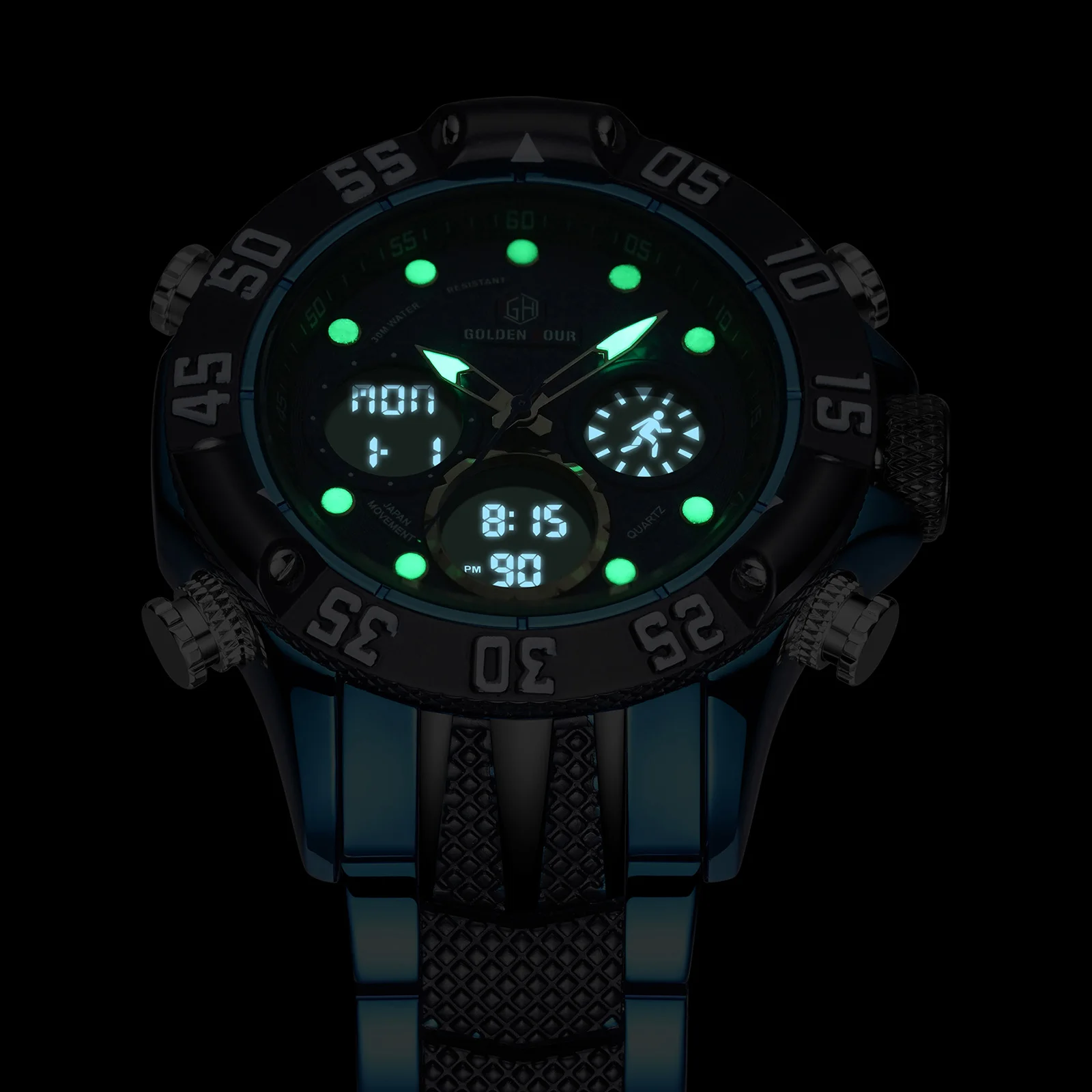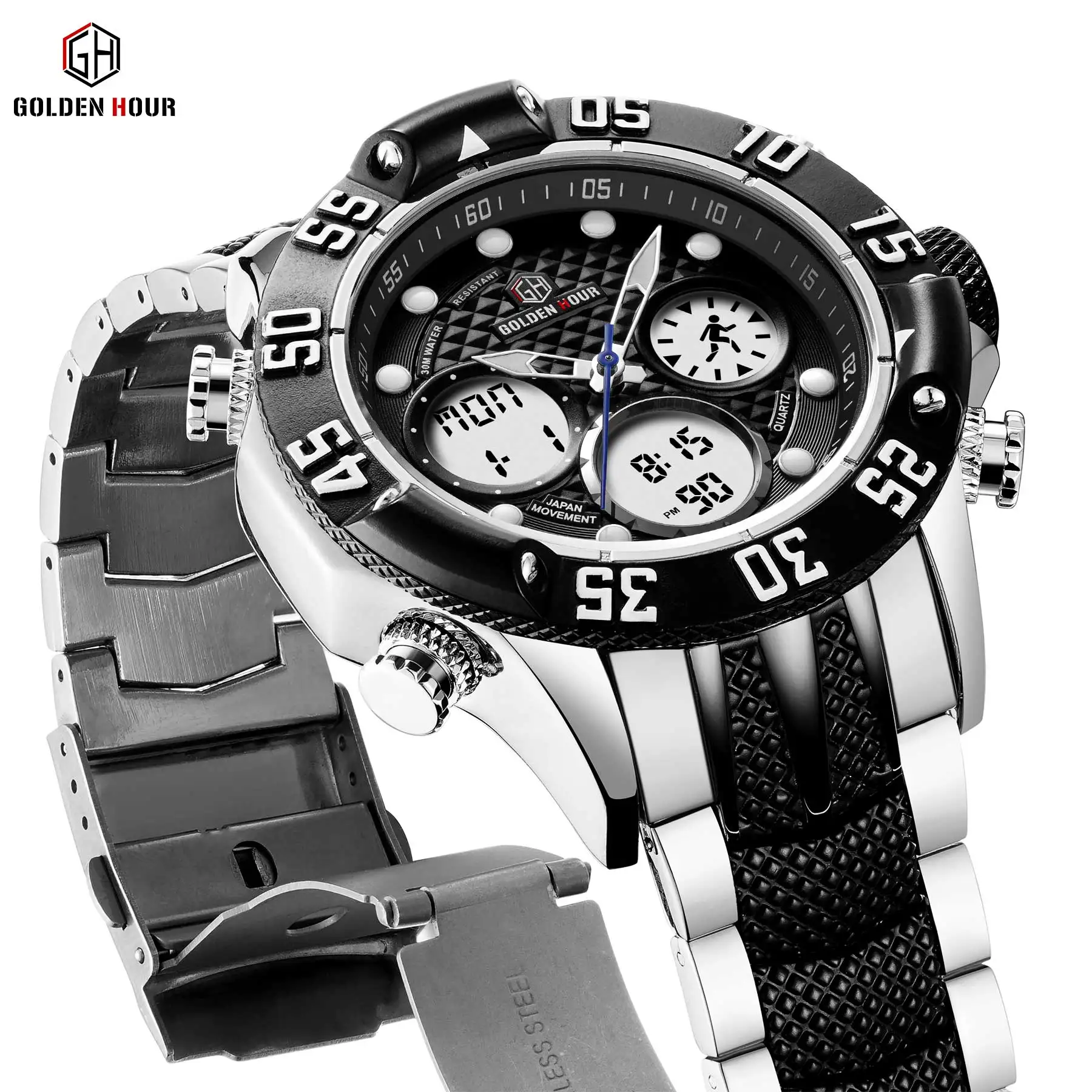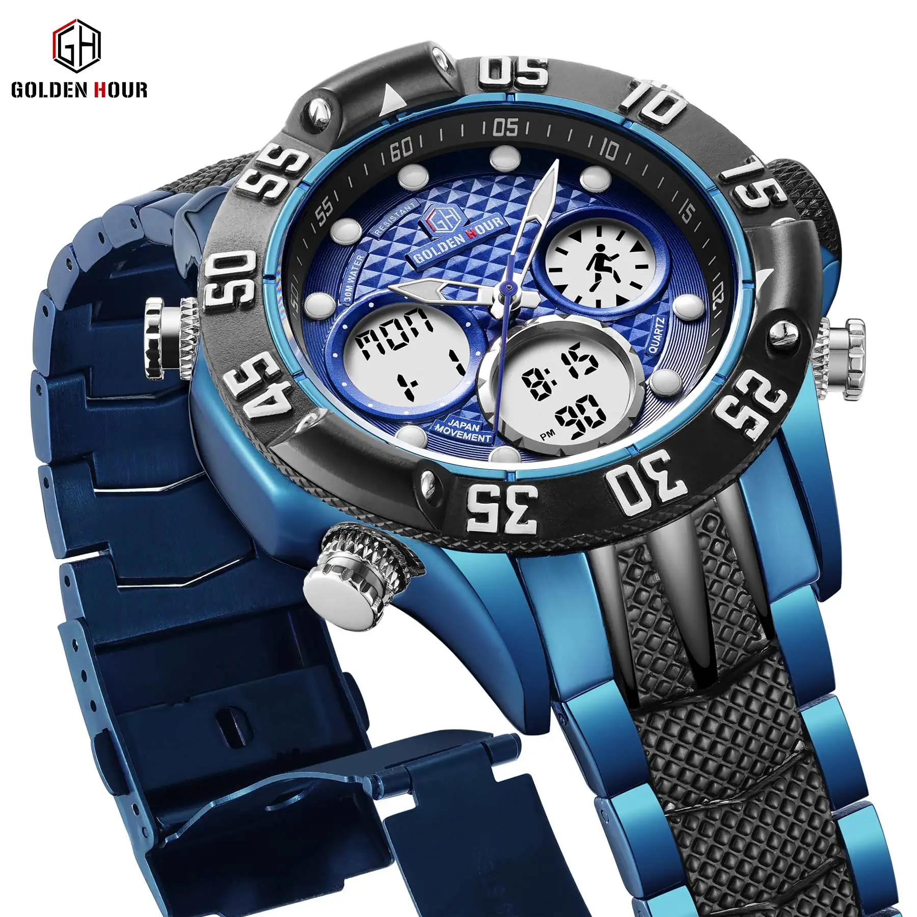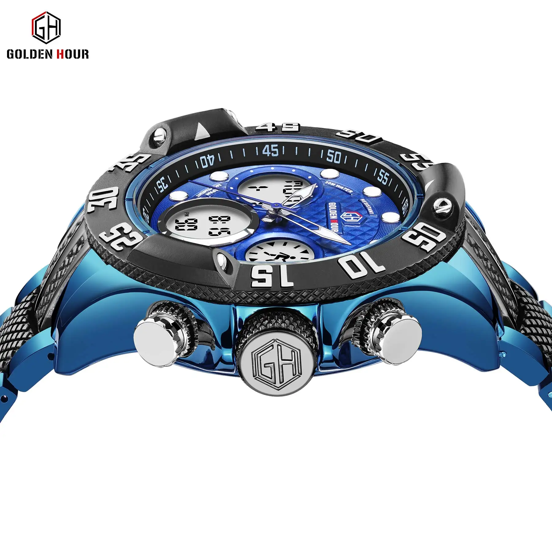Золотые часы спортивные мужские часыБренд: GOLDEN HOURСтиль: Модный, Повседневный, деловой, роскошный, спортивныйОсновная особенность:1. Часы классического дизайна, модный спортивный стиль2. Наручные часы с кожаным ремешком в духе новых модных тенденций.3. Гарантия на передвижение 12 месяцевХарактеристики:Диаметр циферблата: 48 ммТолщина корпуса: 17 ммДлина Часов: 240 ммШирина ремешка: 24 ммВес часов: 207 гМеханизм: двойной дисплей (требуется батарея)Материал зеркала: HardlexТип застежки: застежка для браслетаВодонепроницаемость: Повседневная Водонепроницаемость (не для плавания или душа)Подходящий повод:Идеально подходит для любых случаев и мероприятий вечерние, годовщины, бизнеса, повседневной носки, занятий спортом на открытом воздухе, занятий в помещении или повседневного использованияПосылка1 х часы (подарочная коробка опционально)