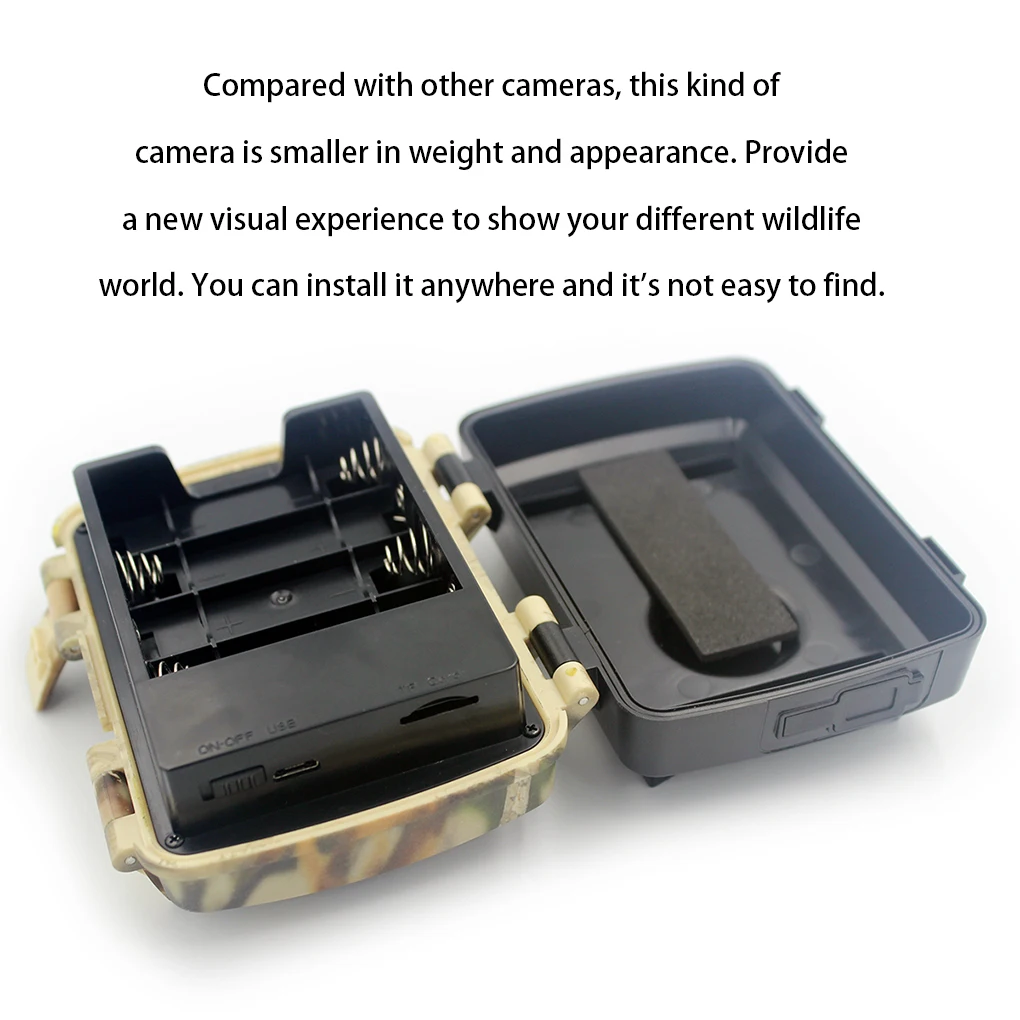 Эта охотничья камера с PIR датчиком может срабатывать движениями и имеет быструю скорость запуска.Эта Водонепроницаемая камера 1080P может делать четкие изображения и видео со звуком, имеет широкий угол обзора объектива.Эта водонепроницаемая охотничья камера Маленькая и легкая, поэтому вы можете легко носить с собой, когда выходите.Эта камера 12MP trail может делать красочные изображения днем и черно-белые изображения ночью.Эта охотничья камера 1080P подходит для многих случаев, таких как охота, скаутинг, наблюдение за животными, Домашняя безопасность и т. д.Характеристики:Материал: АБС-пластик.Цвет: как на картинке.Датчик изображения: 3MP Цвет CMOS.Разрешение фото: 12 МП 4032*3024.Разрешение видео: FHD 1920*1080P 25FPS.Время срабатывания: 0,8 S.Режим работы: фото, видео, фото + видео.PIR угол: 60 градусов.Угол Линзы: 52 градуса.ИК-светодиодный: 38 шт. 850нм черного света, 15 м.Расстояние PIR: 15 м.Память: Макс TF 32 Гб.Разъем USB: 5 контактов USB 2,0.Источник питания: 4 батарейки типа АА (не входят в комплект) или 5 в постоянного тока.Водонепроницаемость: IP54.Время работы: 8 месяцев.Ток в режиме ожидания: 0,01 мА.Размер: 110x92x55мм.Температура: -10 ~ + 70 ℃/-14 ~ + 158 ℉.Примечание:Из–за разных компьютерных разрешений может быть небольшое цветовое искажение.Возможны незначительные погрешности из-за различных ручных измерений.После завершения установки программы камера изменит файл (time.txt), не влияя на время на фото или видео.Посылка включает в себя:1 охотничья камера.1 руководство пользователя.1 кард-ридер.1 подвесная веревка.
