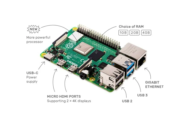 Broadcom BCM2711, Quad core Cortex-A72 (ARM v8), 64-разрядная SoC 1,5 ГГц 1/2/4GB LPDDR4-2400 SDRAM (синхронное динамическое ОЗУ 2,4 ГГц и 5,0 ГГц IEEE 802.11acБеспроводной, Bluetooth 5,0, BLE Gigabit Ethernet 2 порта USB 3,0; 2 порта USB 2,0. Raspberry Pi стандартный 40 pin GPIO Заголовок (полностьюОбратная совместимость с предыдущими платами) 2 × порты micro-HDMI (поддержка до 4kp60) 2-полосный MIPI DSI порт дисплея 2-полосный MIPIПорт камеры CSI 4-полюсный стерео аудио и композитный видеопорт H.265 (4kp60 панель расшифровки жидкокристаллического дисплея), H264 (1080p60 панель расшифровки жидкокристаллического дисплея, 1080p30 кодирование) OpenGL ES3,0 слот для видеокарты Micro-SD для загрузки операционной системы и хранения данных 5 в постоянного тока через USB-C разъем (минимум 3A *) 5 в постоянного тока черезGPIO header (минимум 3A *) Включение питания через Ethernet (PoE) (требуется отдельная шляпа PoE) Рабочая температура: 0 - 50 градусов CОкружающий