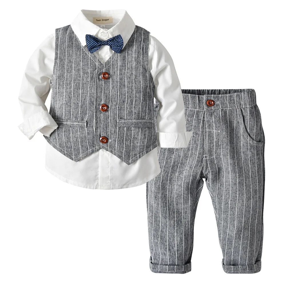 Комплект официальной детской одежды из 3 предметов, весна-осень, хороший джентльменский костюм для маленьких мальчиков, длинная белая рубашка с галстуком-бабочкой, жилет в полоску, брюки, Лидер продаж