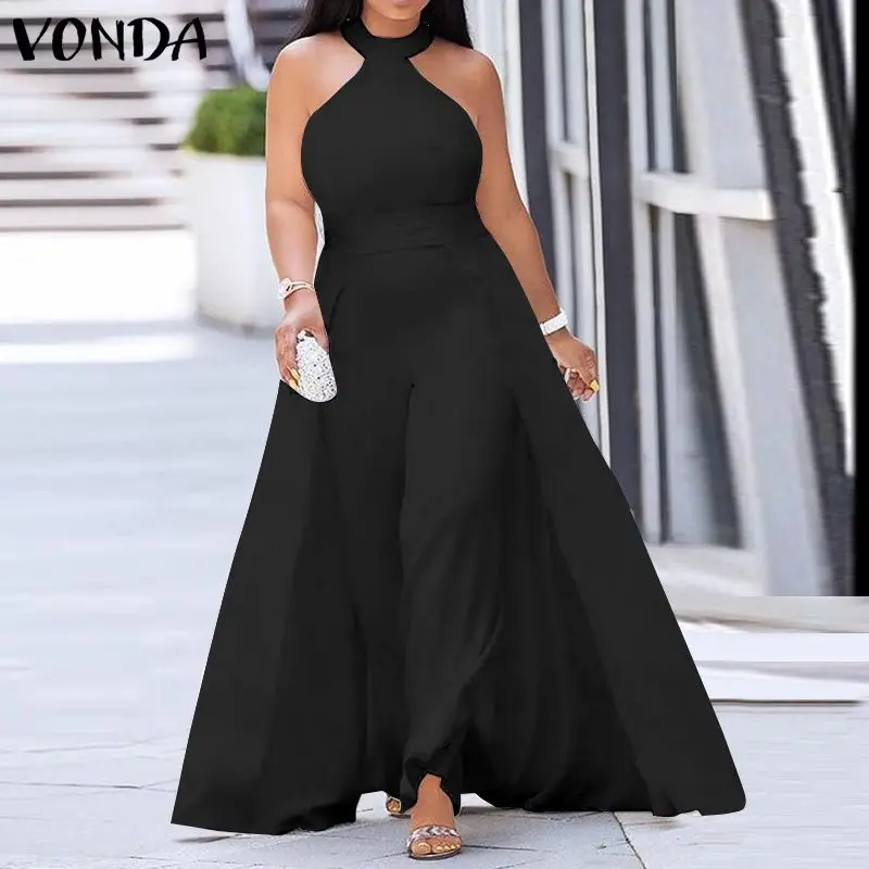 2021 Летний комбинезон VONDA, женские длинные брюки-Палаццо с широкими штанинами, однотонные брюки большого размера без рукавов, сексуальный женский комбинезон с воротником-халтером