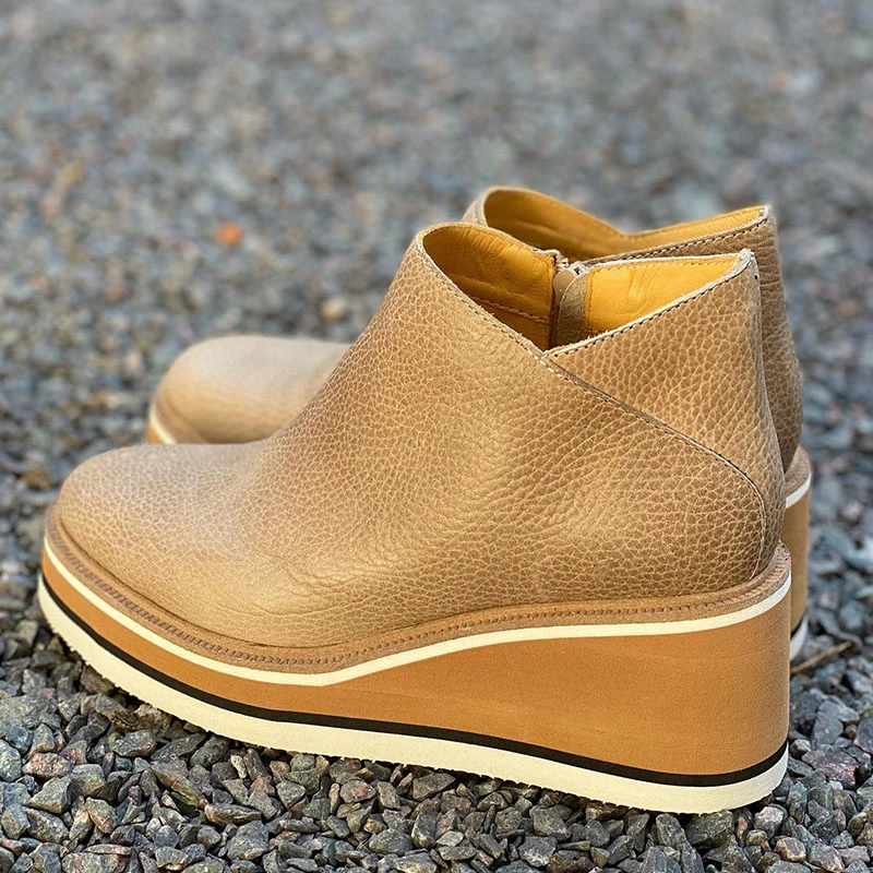 Модные женские короткие ботинки с круглым носком, высокие ботинки на танкетке в стиле ретро, удобные ботильоны из мягкой кожи на молнии для женщин