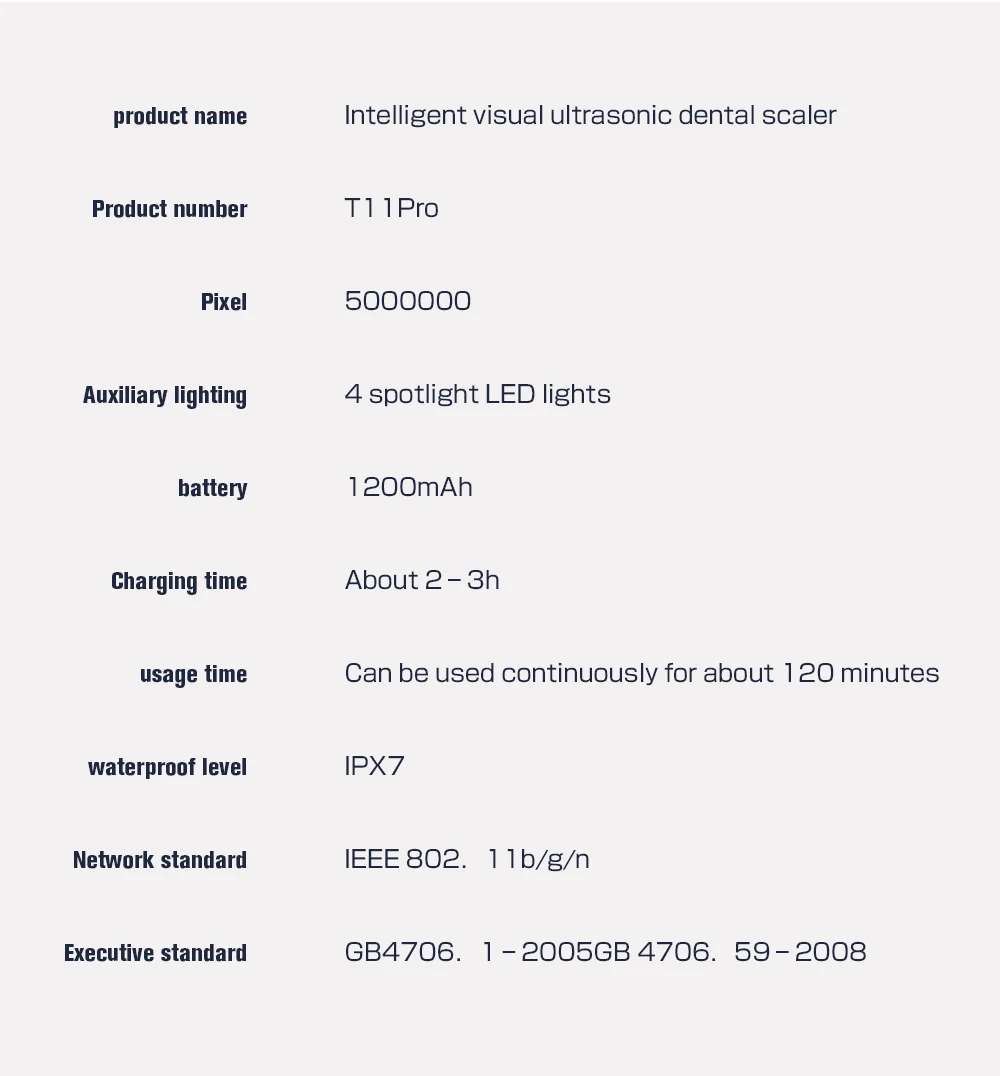 Название продукта: Интеллектуальный визуальный ультразвуковой Стоматологический СкейлерМодель продукта: T11ProПиксель: 5 миллионовВспомогательное освещение: Светодиодный прожектор 4 шт.Аккумулятор: 1200 мАчВремя зарядки: около 2-3 чВремя использования: около 120 минут непрерывного использованияВодонепроницаемость: IPX7Сетевой стандарт: IEEE 802.11b/g/n