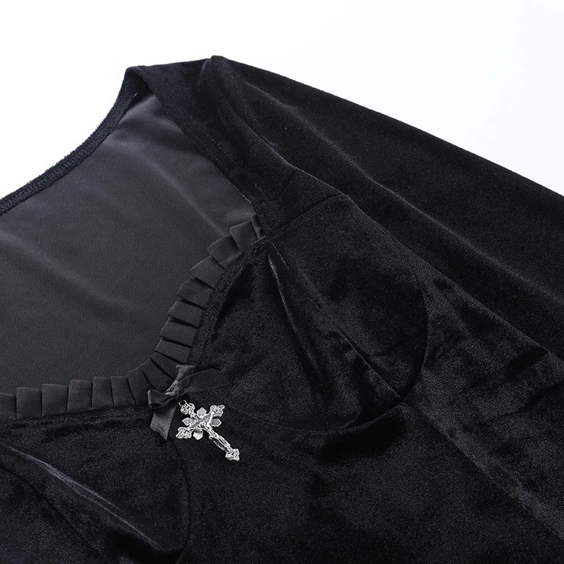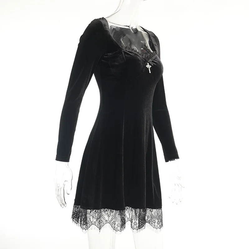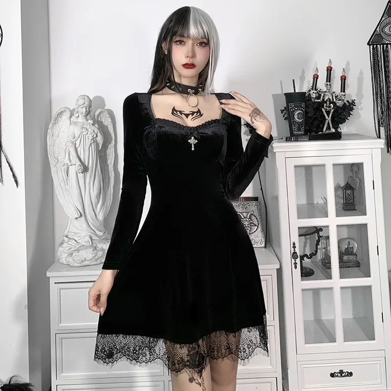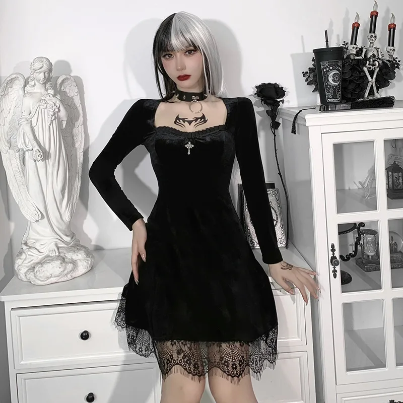 Insgoth gótico do vintage preto mini vestido estético elegante cruz pingente de cintura alta vestido streetwear manga longa vestidos de festa