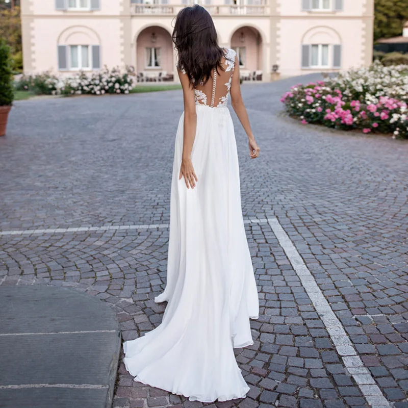 Новинка 2021 г., Элегантное свадебное платье с разрезом сбоку, прозрачное шифоновое платье-трапеция с рукавами-крылышками, аппликацией и шлейфом, на пуговицах