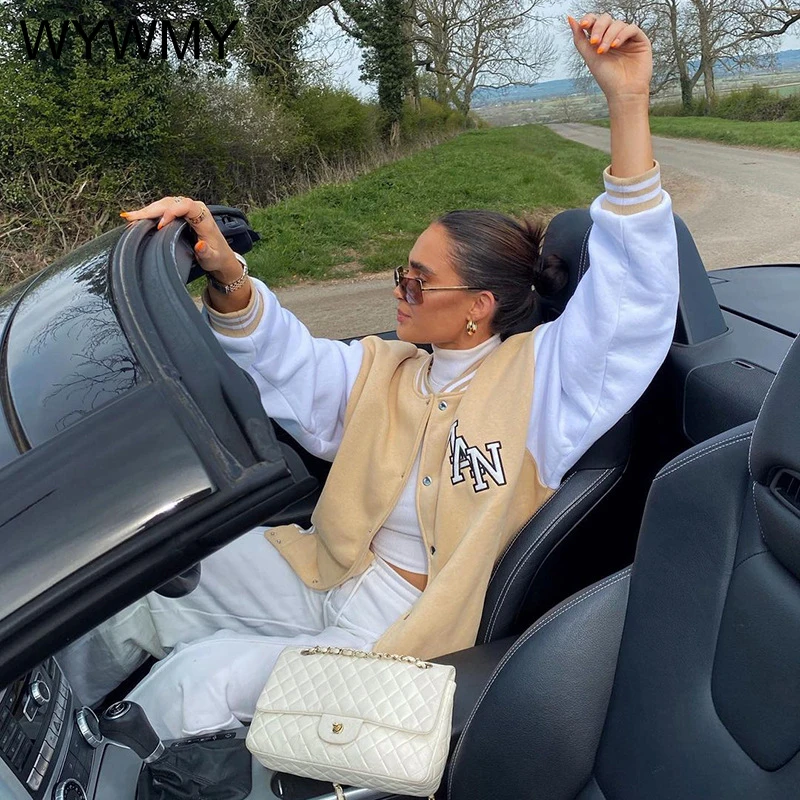Женская бейсбольная куртка большого размера, куртка цвета хаки с длинным рукавом и буквенным принтом в стиле пэчворк, модное Свободное пальто, Осень-зима