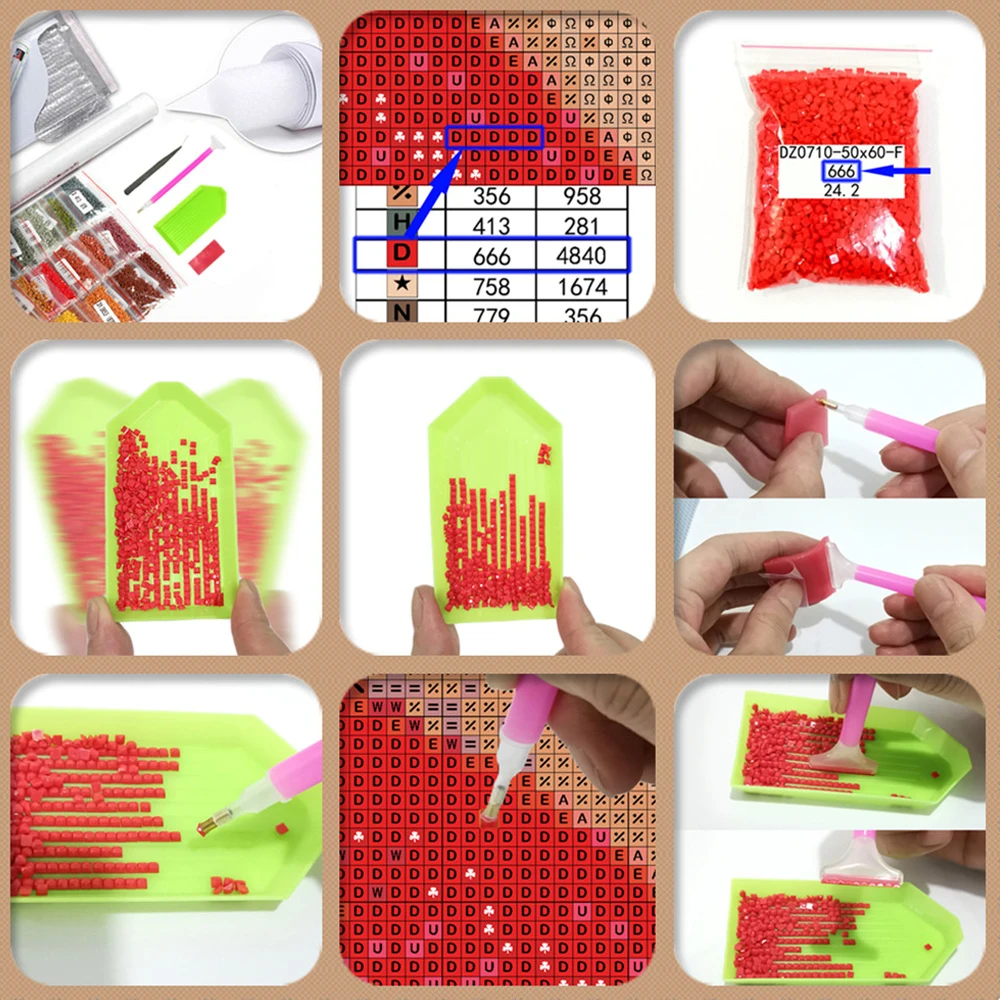 2. Вставьте круглый конец ручки в Дозирующий цемент (нажмите, чтобы сохранить цемент на месте).3. Используйте круглый конец ручки, чтобы приклеить бриллиант и слегка нажмите, чтобы удалить любой дополнительный цемент.4. Разорвите частичную пленку и поместите алмаз на холст в соответствии с соответствующим номером.5. Если вы приклеите алмаз к неправильной области на картине, удалите алмаз пинцетом.6. После завершения слегка прижмите алмазы рукой или книгой, чтобы убедиться, что алмазы надежно закреплены.