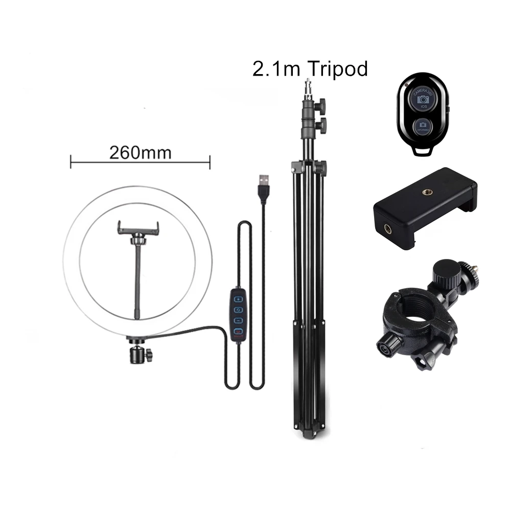 环形灯 产品详细信息: 流光 светодиодный 流光灯 1. 三种灯光模式(白色,暖白色,暖黄色) 2. 带防滑脚的稳固三脚架支架 10 级照明亮度 3. 通用手机支架(宽 2,36 "至 3,35") , 仅适用于 26 см 环形灯) 快速简便的组装,拆卸 4. 可调节灯架适用于通用高,非常稳定. 5.用影楼补光拍照,人像自拍补光. 6.影楼环形led灯USB插头补光灯. 7.适用于多种社交,如化妆,视频直播,工作室灯,摄影. 套餐包含: 请看图片详情