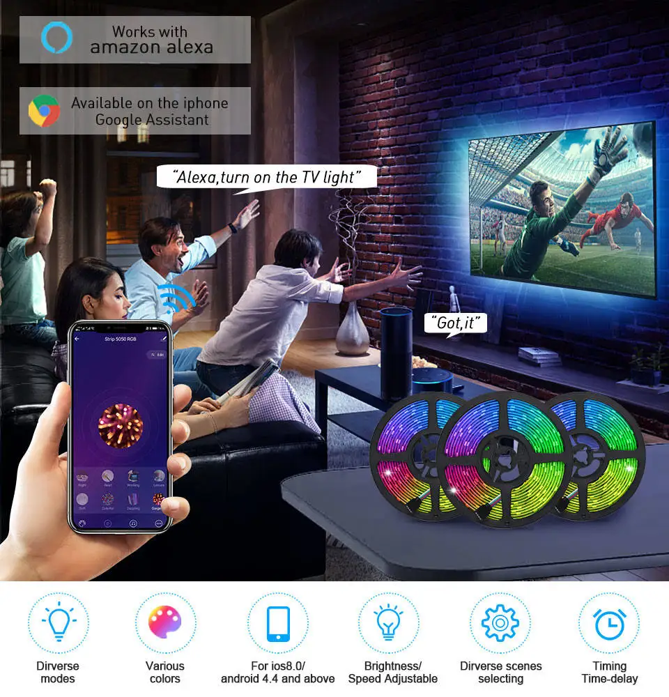 【 WiFi Светодиодные полосы света для вашего умного дома 】работа с Alexa, Google Home, мощный с помощью приложения Smart Life или Tuya, голосовое управление, различные цветовые режимы, несколько режимов сцены, регулировка яркости, таймер, синхронизация музыки (распознавание музыки внутри и снаружи телефона)(5G не поддерживается).