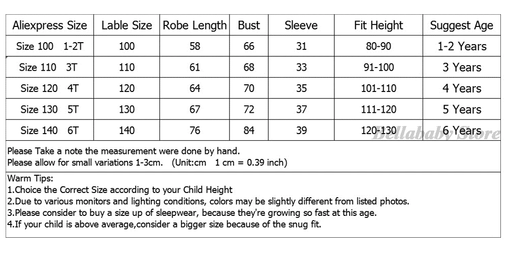 Aliexpress размер 100-От 1 до 2 лет, Lable размер 100,? Длина халата: 58 см, обхват груди: 66 см,? Длина рукава: 31 см, рост: 80-90 см, рекомендуемый возраст: 1-2 года