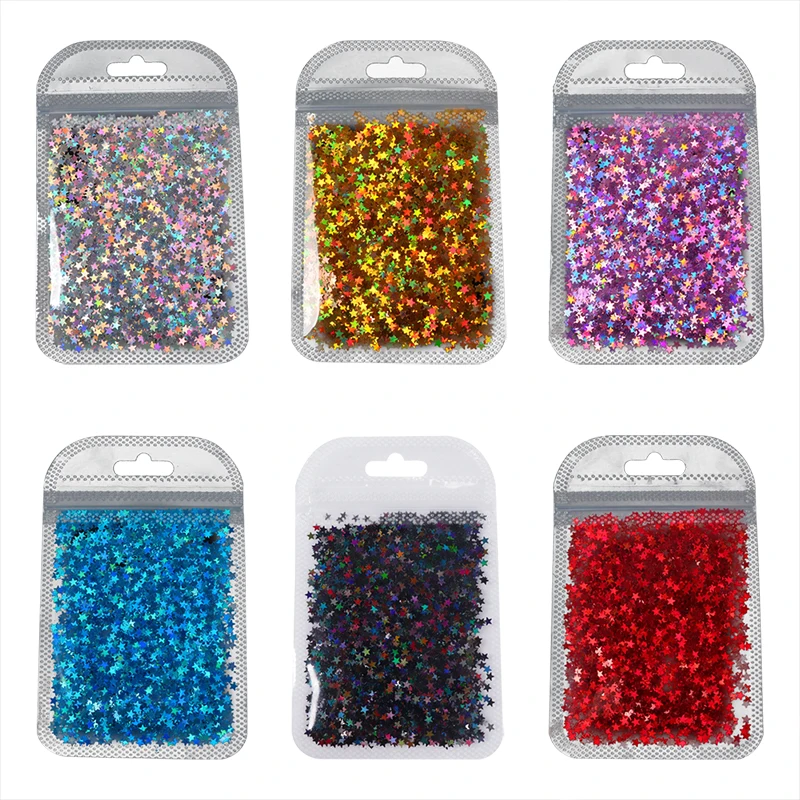 Название продукта: блестки с градиентной звездой Цвет: голографический лазер Хамелеон серебряное золото AB синий розовый Количество: 1 сумка Дизайн: DIY украшения для дизайна ногтей Упаковка: 1 сумка для дизайна ногтей со звездами и блестками