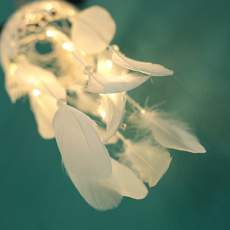 Ветряные колокольчики, Ловец снов ручной работы, сетка, белая кружевная лента, перья, настенное искусственное ремесло, подарок, украшение для дома с лампой