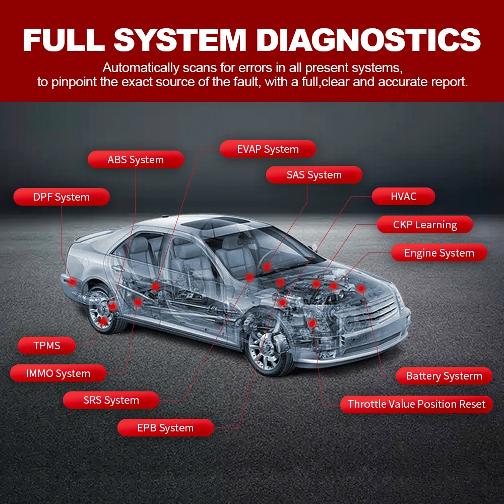 Эта опция позволяет определить, являются ли Системные параметры нормальными или нет.Включает: системы ABS, системы двигателя, системы SAS, Системы TPMS, системы IMMO, системы батареи, системы обслуживания масла, системы SRS, системы DPF, системы кондиционирования воздуха, системы передачи, и т. Д...Считывание и стирание кодов для всех доступных систем, выключение светильник MIL (индикатор-светильник), отображение данных в реальном времени в текстовом, графическом и аналоговом формате для удобного просмотра данных.