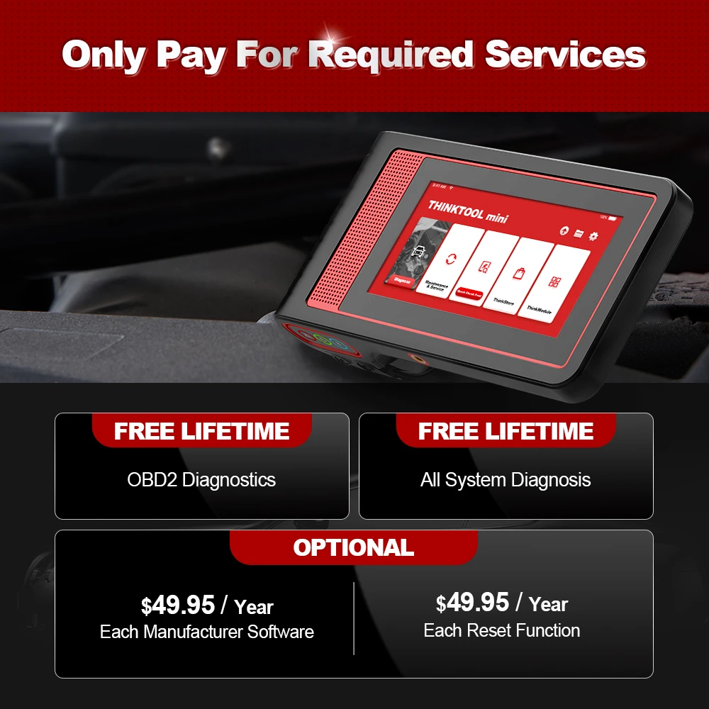 Thinktool mini, как диагностическое устройство OBD II высшего уровня для пользователей DIY, поддерживаемое, включает считывание кода/очистку потока данных, испытание на приведение в действие, специальные функции и т. д.1. Бесплатное считывание кода в системе, очистка кода, потоковая передача данных и обновления для всех моделей.2. Функция полного сброса бесплатна для использования (в настоящее время 16 и будет увеличена до 26-28 позже).3. После подписки на программное обеспечение, вся система может быть диагностирована с полными функциями (экшен-тест, специальная функция, cding может быть осуществлена).4. Система Android может быть обновлена онлайн.5. Вся система диагностирует более 93 автомобильных брендов.6. Диагностика охватывает все модели, поддерживающие протокол OBD после 1996 года.7. Оснащен интеллектуальными идентификационными моделями с кодом VIN.8. Дизайн серии THINKCAR, пылезащитный, ударопрочный, легко хранить9.5.99 дюймовый дисплей удобен для диагностики автомобиля в режиме реального времени10,2G RAM/ 32G ROM, поддержка Bluetooth и WiFi подключения11. Оплатите один автомобиль модель программного обеспечения может наслаждаться бесплатным обновлением 1 год полной системы, такие как: ECU кодирование/экшен тест и другие специальные функцииСтоимость: $49,95/год (вы можете купить напрямую из ThinkCar Store)