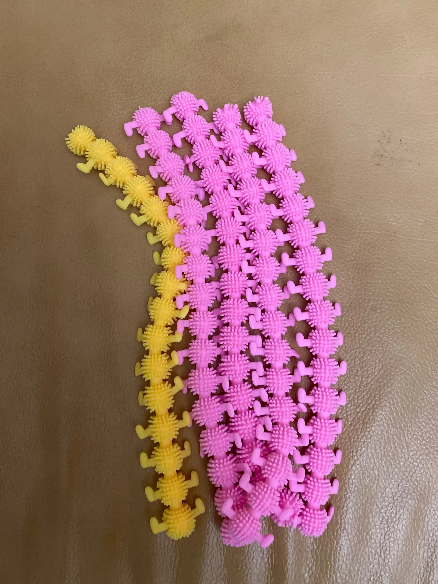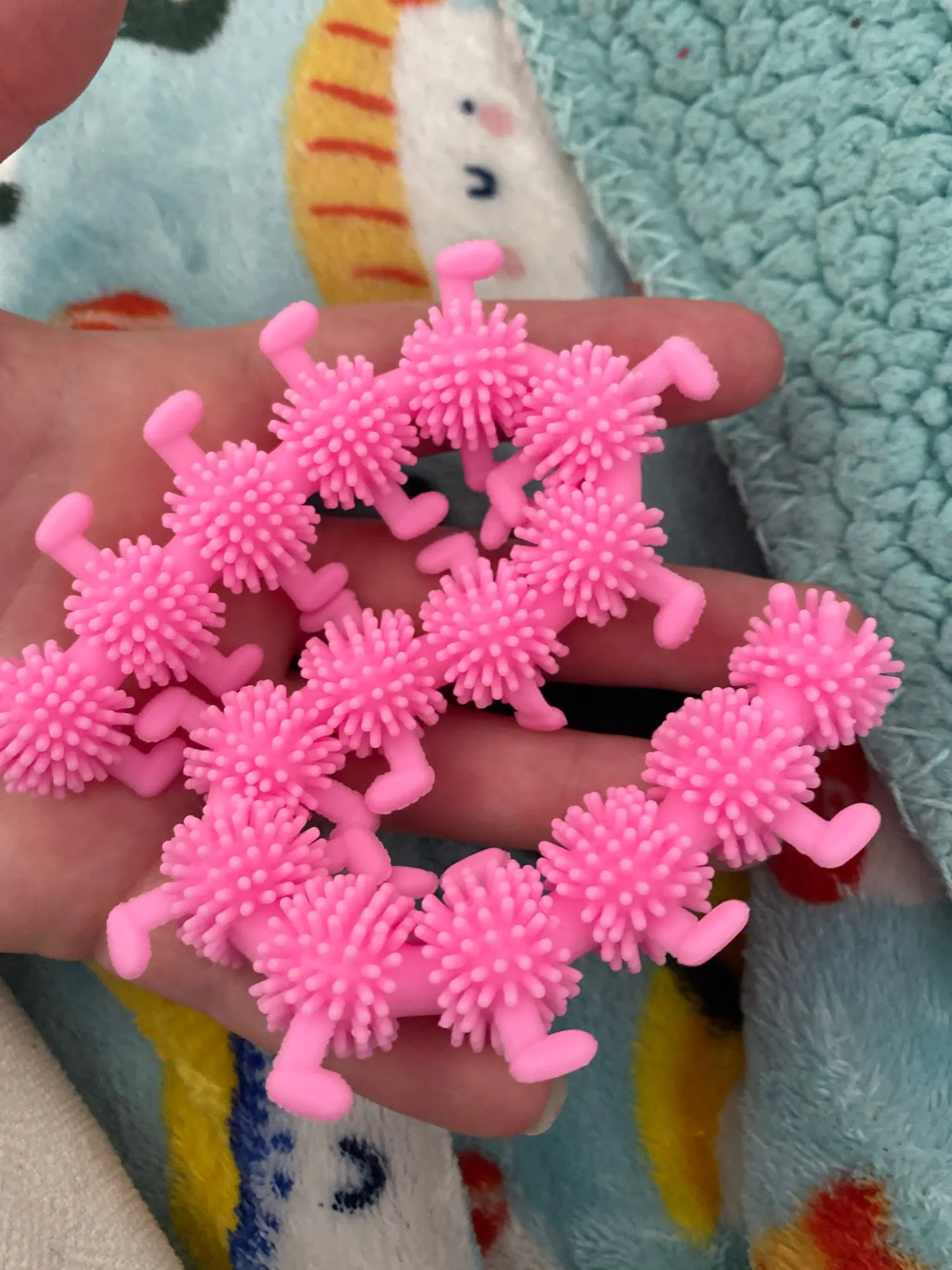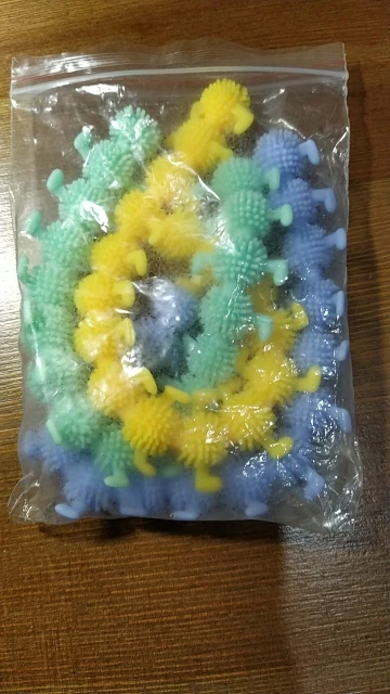 Немного посыпано тальком, чтобы не слипалось. Оно без липучек, которые бы сами на себя цеплялись. Для крепления на руке нужно узел завязывать. Нормальный антистресс маленькому ребенку