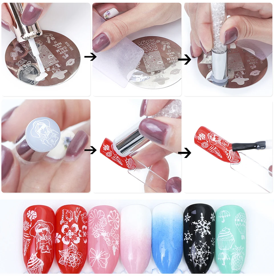 Шаг 1: нанесите Базовое покрытие и цвет лака на ногти.Шаг 2: нанесите лак для штамповки на штамповочные пластины.Шаг 3: Используйте скребок для снятия чрезмерного лака для штамповки.Шаг 4: быстро нажмите кнопку stamper, чтобы подобрать рисунок.Шаг 5: узор выполнен и переносится на поверхность ногтей.Шаг 6: нанесите верхнее пальто, чтобы закончить дизайн ногтей.