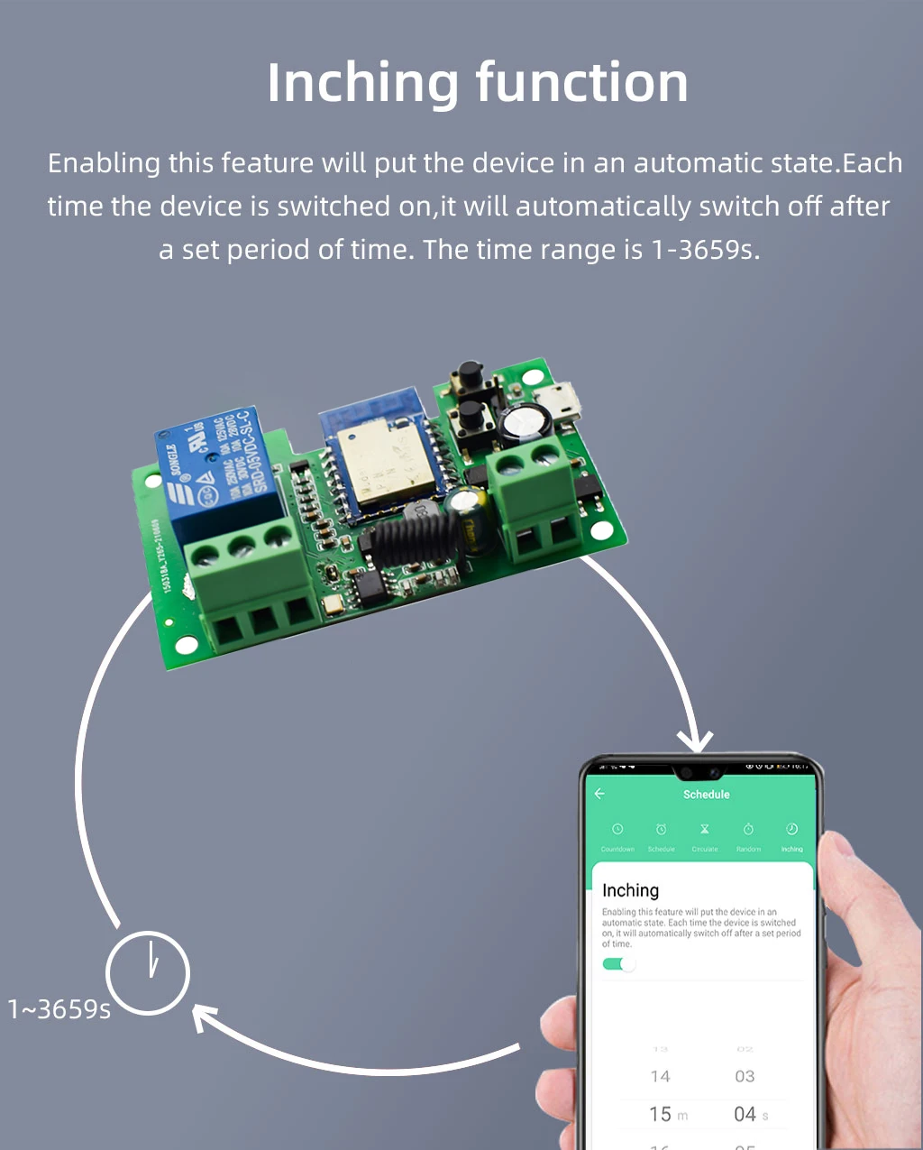Этот продукт является беспроводным мгновенным (inching) переключателем. Пользователи могут добавить устройство в приложение для удаленного управления подключенными бытовыми приборами или цепями питания.Примечание: реле являются переключателями без выхода, вход источника питания (DC) только для PCBA.