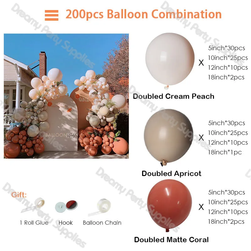 Крем персиковый (5 дюймов * 15 шт., 10 дюймов * 15 шт., 12 дюймов * 5 шт., 18 дюймов * 1 шт.) Абрикосовый (5 дюймов * 15 шт., 10 дюймов * 10 шт., 12 дюймов * 5 шт., 18 дюймов * 1 шт.) Двойной матовый Коралл (5 дюймов * 15 шт., 10 дюймов * 10 шт., 12 дюймов * 5 шт., 18 дюймов * 1 шт.) Подарок для вас: 5 м цепочка на воздушный шар * 1 Воздушный шар Клей * 100 Крючок * 3