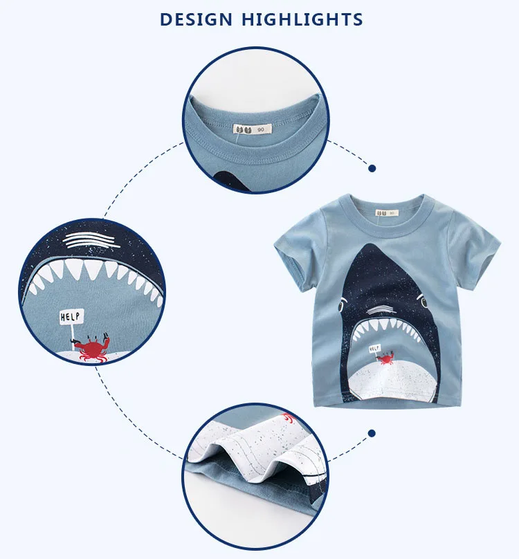 Футболки с изображением акул для мальчиков и девочек, летняя детская одежда с мультяшным рисунком, футболка из 100% хлопка для детей от 2 до 7 лет