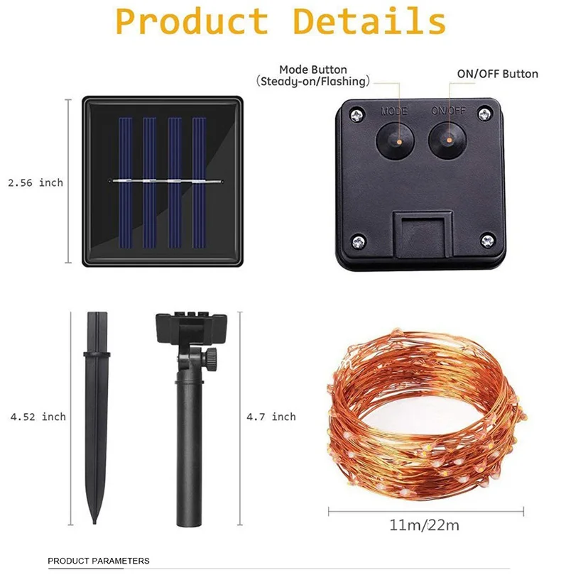 7M-50LED/12M-100LED/22M-200LED/32M-300LED/42M-400LED,Шаг 10 см,Удлинительный кабель 2 мПанель солнечных батарей: 1,2 v 150ma