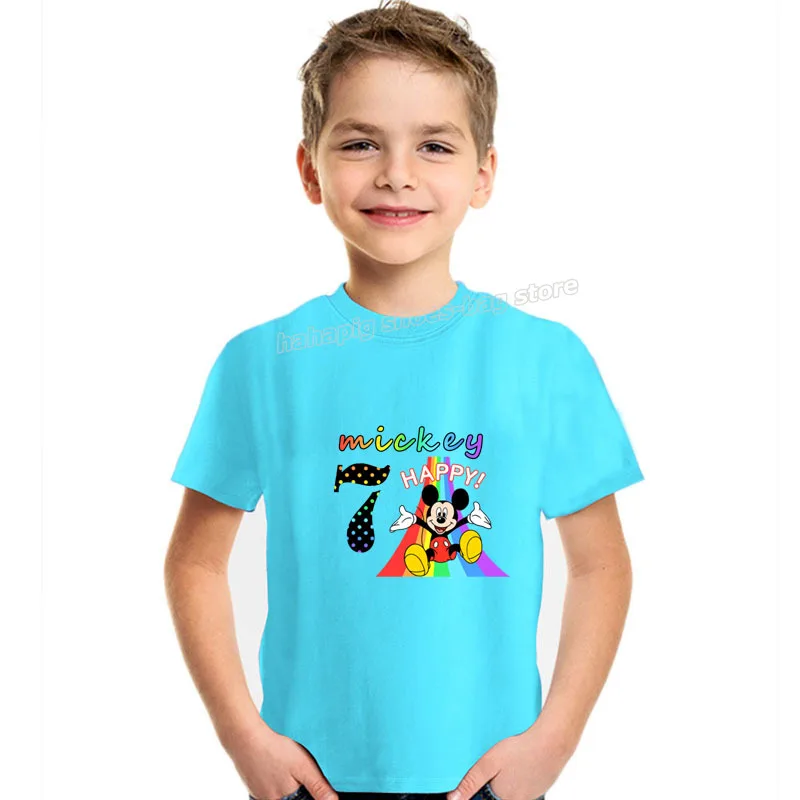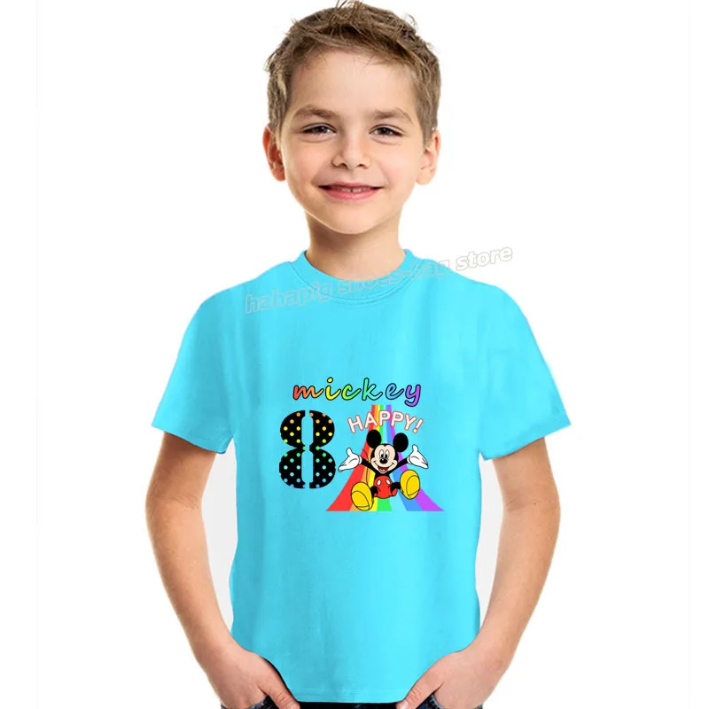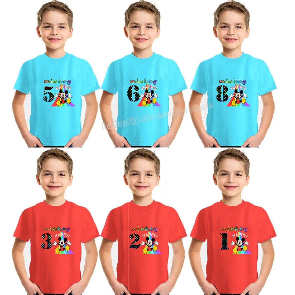 Хлопковая футболка для девочек и мальчиков Disney, рубашка с рисунком Микки Мауса и радужных цифр, летние топы с мультяшным принтом, детская одежда, подарок на день рождения
