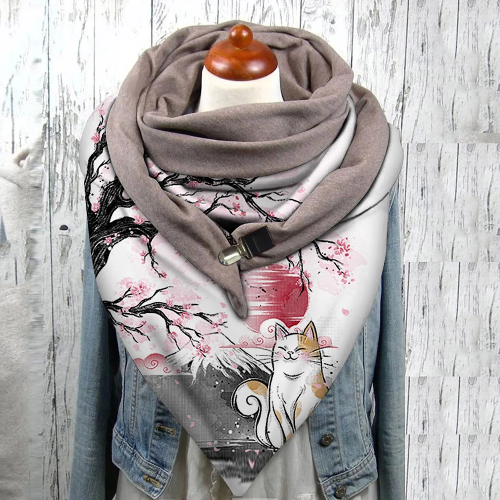 Универсальный осенне-зимний теплый ветрозащитный двухслойный шарф с пряжкой и принтом кота