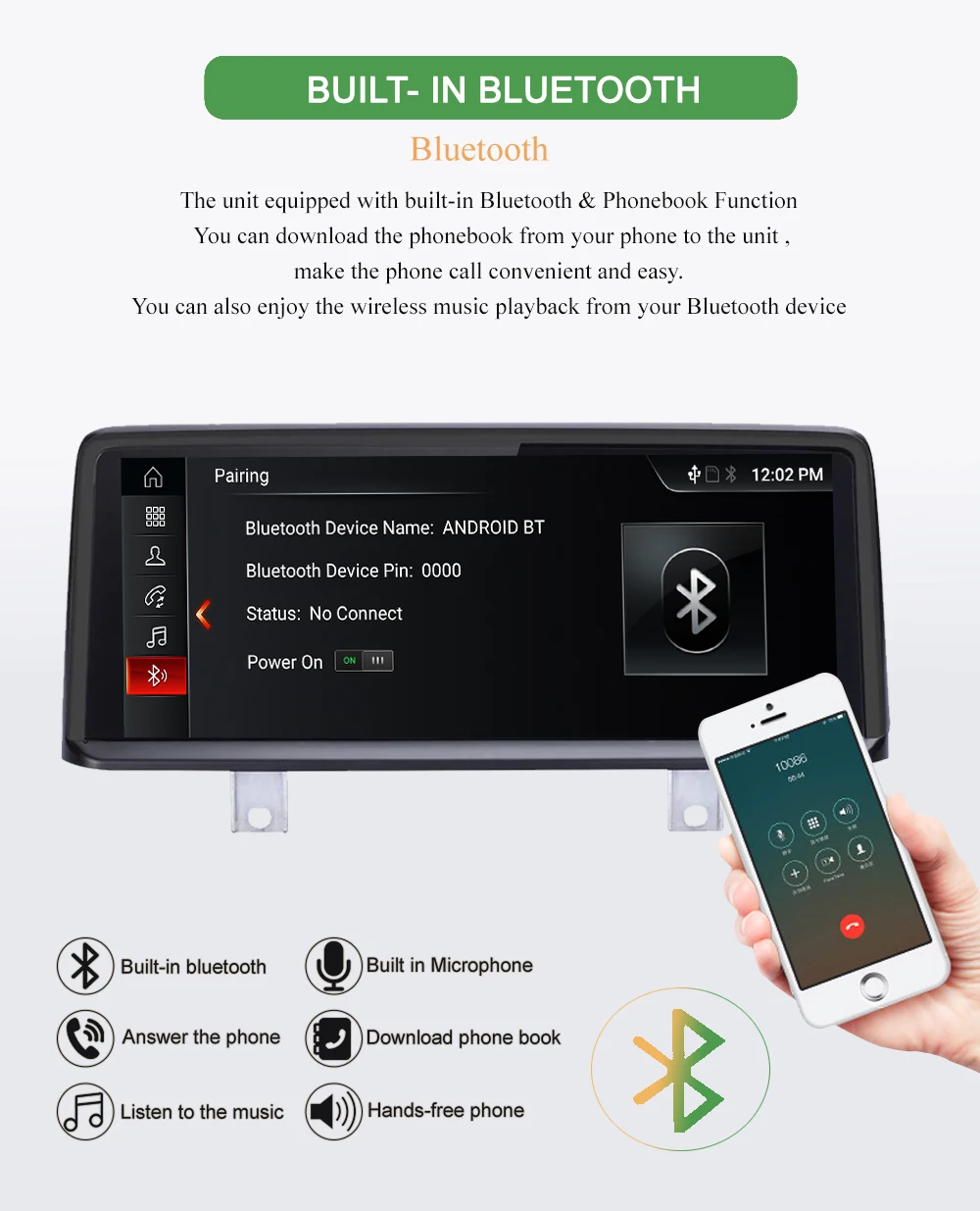 Версия Bluetooth: 4,0, поддержка громкой связи, звонков по bluetooth, входа в телефонную книгу, музыки по bluetooth.