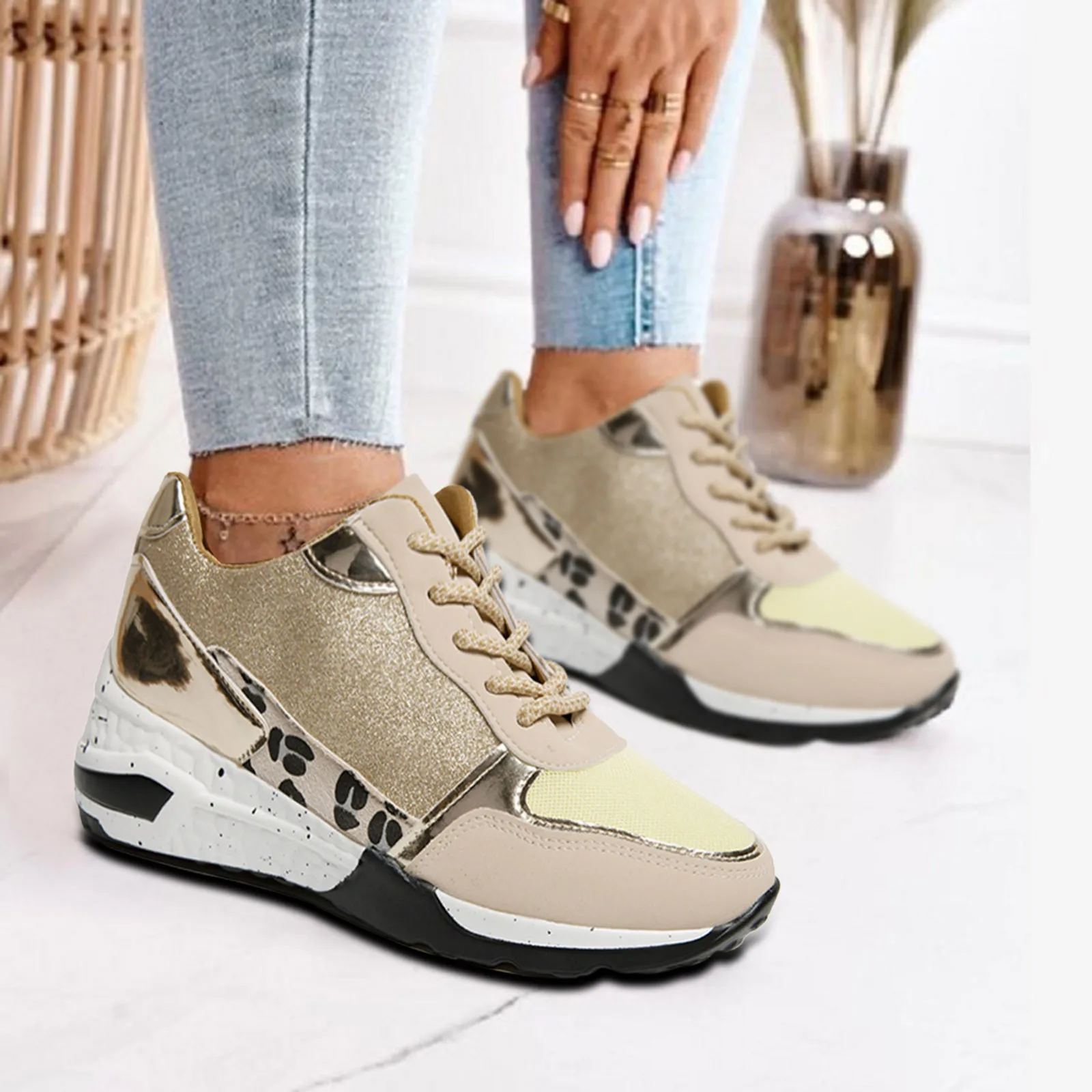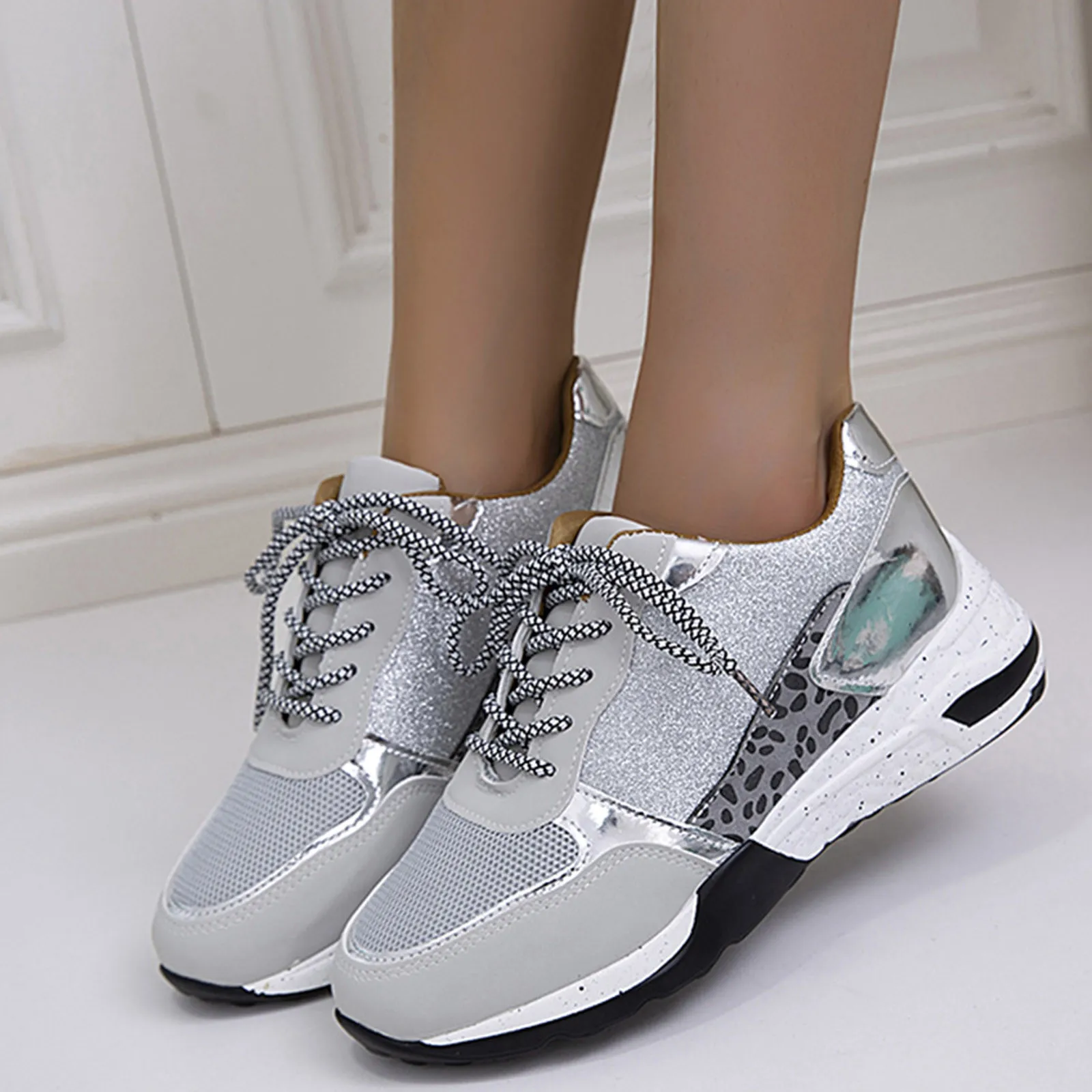 Женские Модные Повседневные кроссовки с блестками на шнуровке большого размера