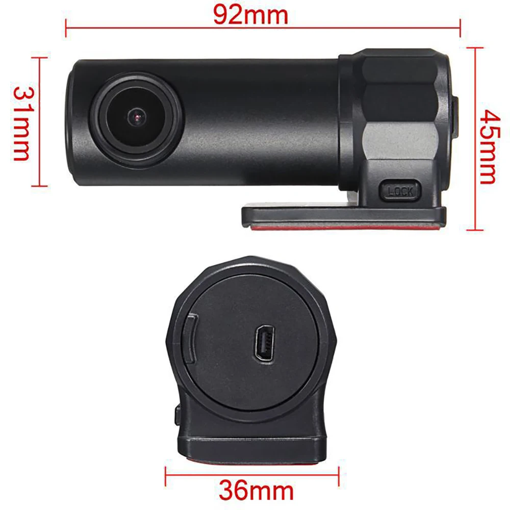Технические характеристики1. Разрешение записи: 1920*1080, 1280*720(30 кадров в секунду/с)2. Объектив: 170 °/6G/F = 2,03. Формат видео: M-JPG4. Формат изображения: JPG5. Внешняя карта Micro TF (макс.. 32 г)6. Источник питания: 5 В 1A постоянного тока7. Размер продукта: 92*35*36 мм8. Подключение: автомобильное зарядное устройство