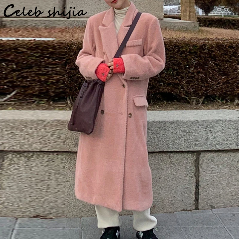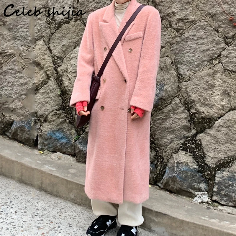 Женское двубортное пальто, длинное кашемировое пальто из смесовой шерсти, корейское, розовое, осенне-зимнее, 2021