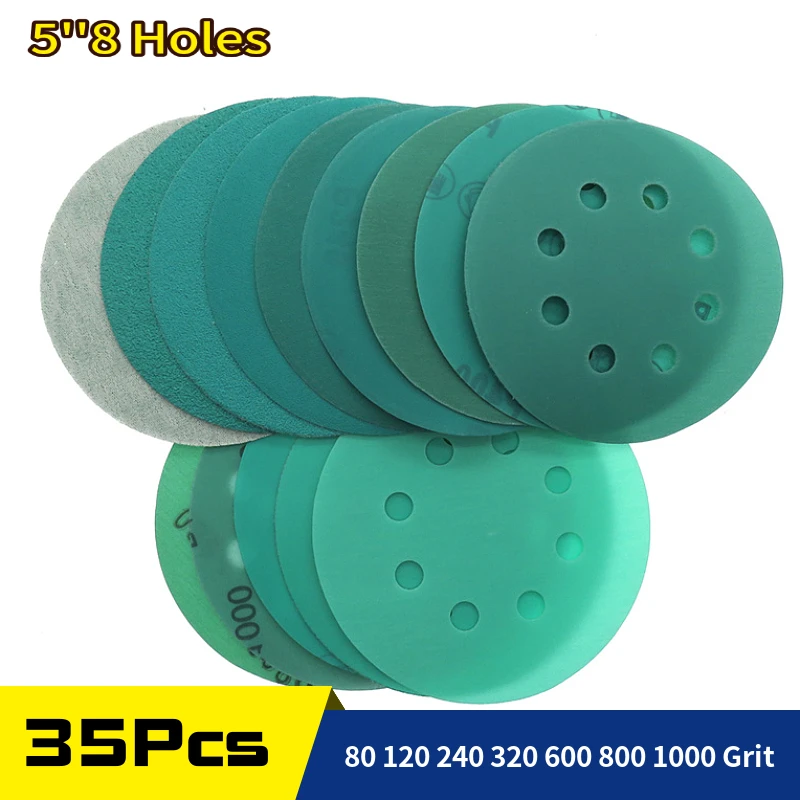 Шлифовальный диск, 35 шт., 5 дюймов, 8 отверстий, 80, 120, 240, 320, 600, 800, зернистость на липучке, полиэфирная пленка, 1000, полировальные инструменты