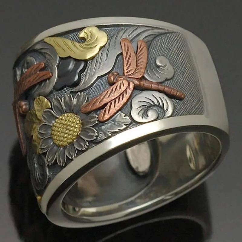 Кольцо с резным подсолнухом и стрекозой для мужчин и женщин, массив...